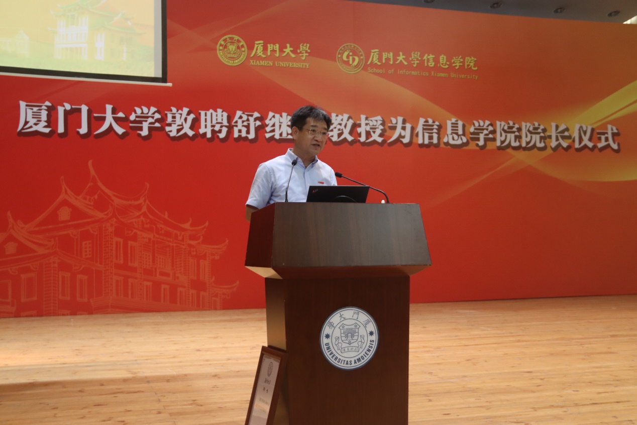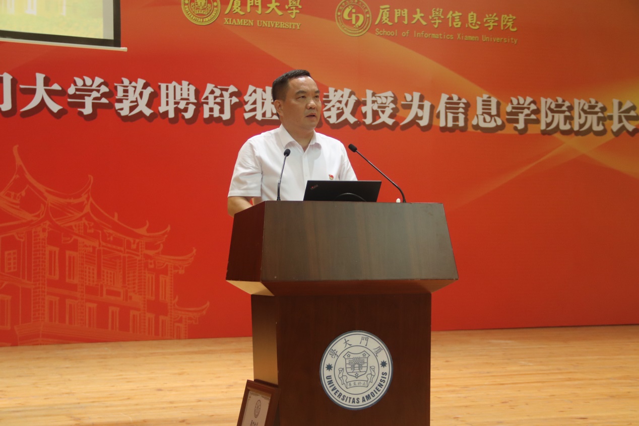 信息学院党委书记刘弢深情回顾了一年多时间聘任舒继武院长的曲折过程,他强调,首任院长的到任意味着信息学院事业发展开启新的征程,这体现了学校党委、行政和职能部门对信息学院班子建设和事业发展的关心爱护和大力支持,学校对信息学科的发展高度重视、寄予厚望。他提出三点希望,一是希望舒继武院长尽快熟悉情况,尽快转换角色,尽快适应院长岗位,尽力履职,领跑好信息学院新的发展征程第一棒;二是希望信息学院全体同仁,把握大势,抓住机遇,真干实干,展现作为,全力支持舒院长的工作、支持班子的工作,以百倍的信心和努力投入学院事业发展中,在厦门大学迈向新的百年,创建一流大学的新征程中写好信息人的奋进之笔;三是希望学校能够给予信息学院更多的关注、更大的支持,使信息学科发展处在历史最好的时期、离一流目标最近的时期,在新院长的带领下,茁壮成长,枝繁叶茂,硕果累累。