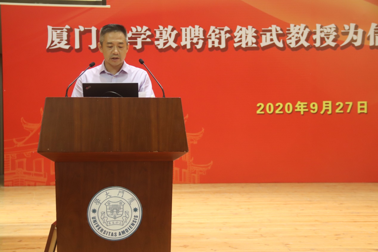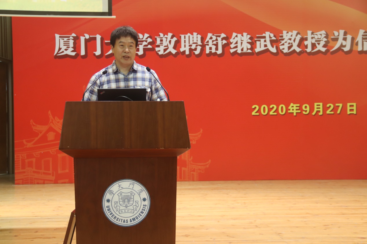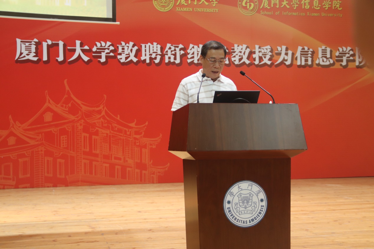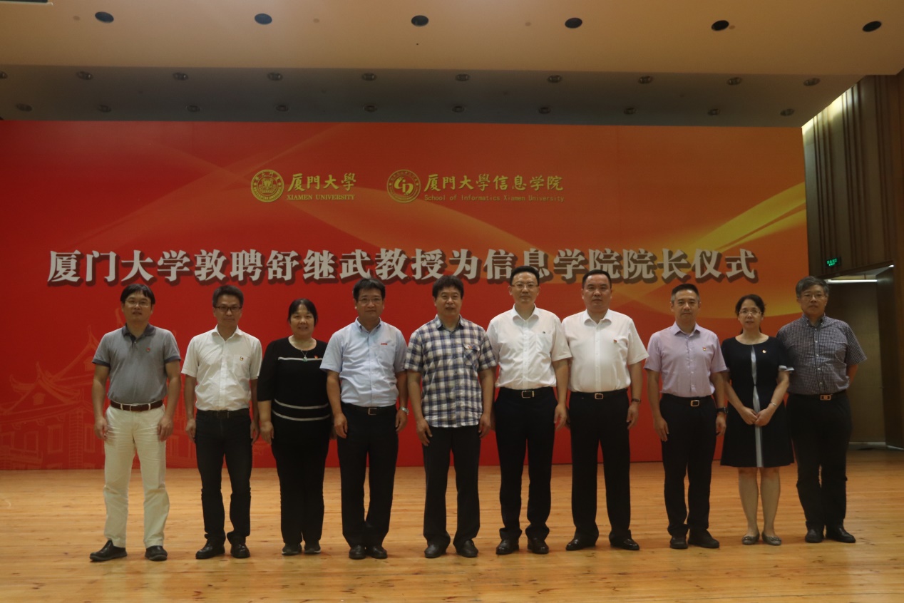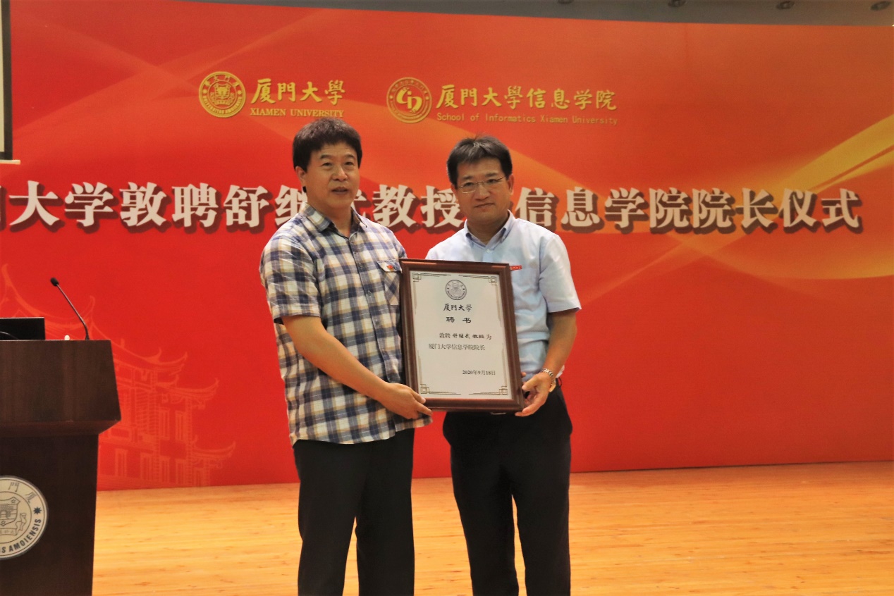 9月27日,学校在科学艺术活动中心音乐厅举行仪式,敦聘舒继武教授为厦门大学信息学院院长。校党委常务副书记李建发同志宣布聘任决定,校党委常委、副校长江云宝同志代表学校颁发聘书并讲话,校党委常委、组织部部长孙理同志主持会议。信息学院党政领导班子成员、师生代表参加了大会。
