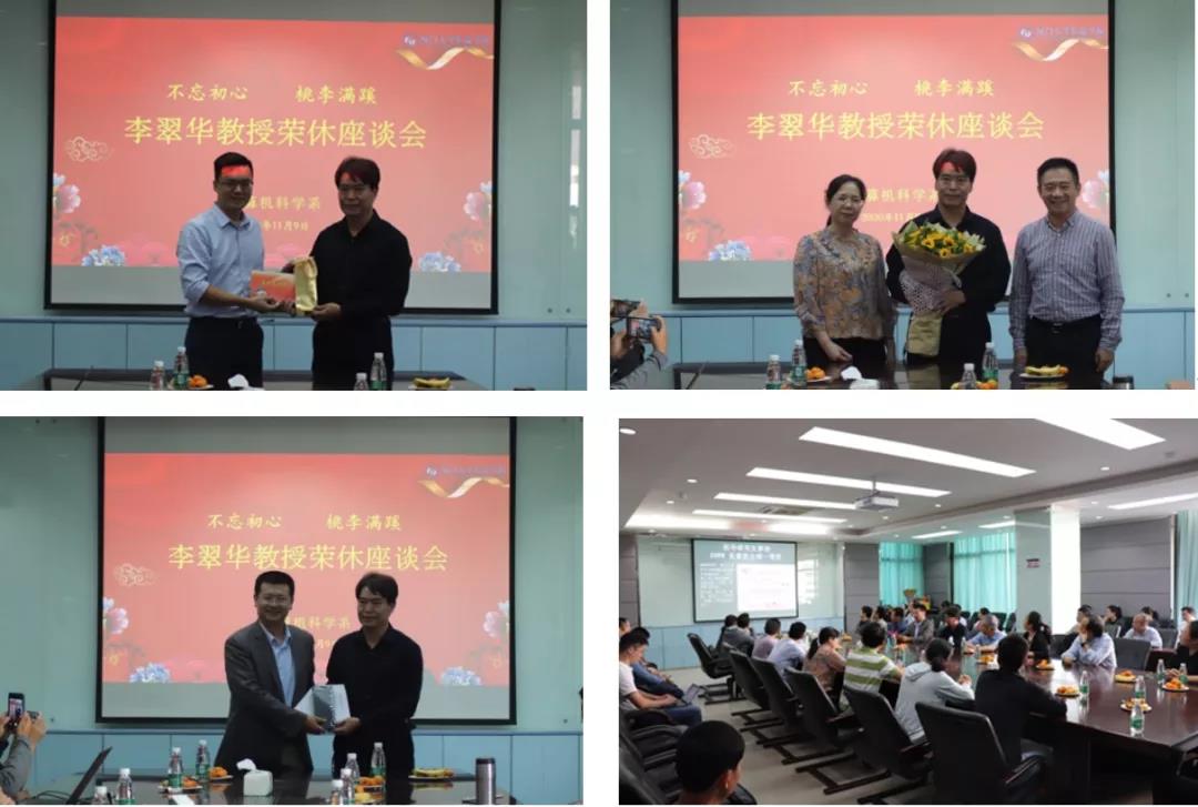 厦门大学计算机系李翠华教授的荣休座谈会于2020年11月9日在信息学院行政楼A306会议室举行。人事处柯自聪科长、信息学院领导王程副院长、龙坚毅副书记、计算机系主任王菡子教授、副系主任刘向荣教授、系党支部书记曲延云教授、系工会程明教授,以及计算机系二十余位教师和四位学生代表参加了荣休座谈会,会议由计算机系主任王菡子教授主持。