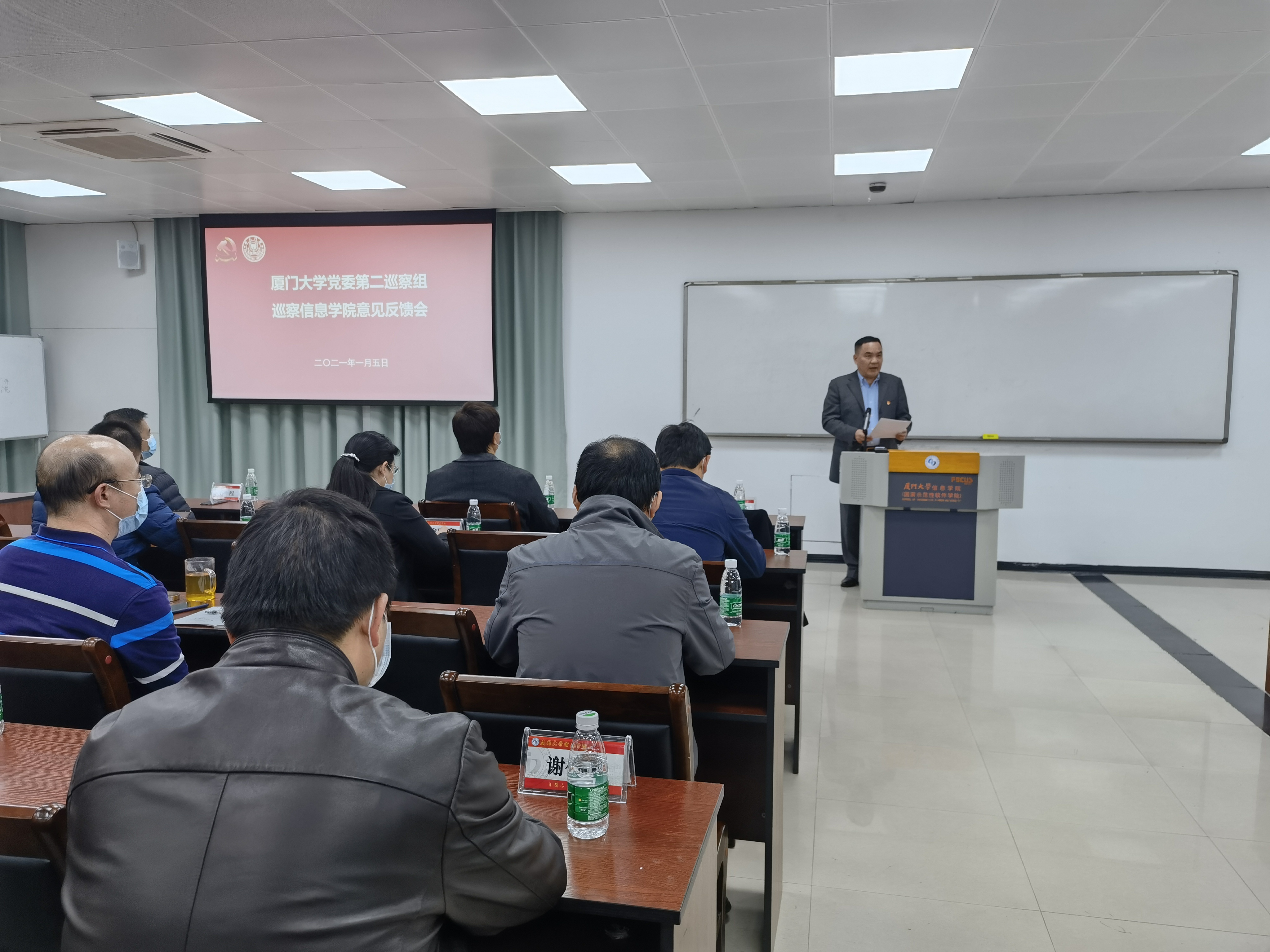 1月5日下午,校党委第二巡察组巡察信息学院意见反馈会在海韵园行政楼A201会议室召开。校纪委副书记、纪委办主任、巡察办主任林金枝,第二巡察组组长叶鹏飞,副组长黄定基,联络员郑建斌,学院党政领导班子成员、全体在职教职工和部分退休干部代表参加反馈会。会议由学院党委书记刘弢主持。