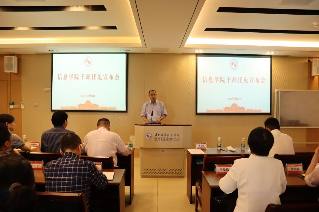 日前,学校党委经研究,决定:廖明宏任厦门大学信息学院副院长,袁飞、张俊松任厦门大学信息学院副院长(试用期一年),洪学敏不再担任厦门大学信息学院副院长职务。5月12日上午,信息学院召开干部任免宣布会议。校党委常务副书记林东伟到会宣布校党委、校行政决定并讲话。校党委常委、组织部部长、统战部部长孙理同志主持会议。