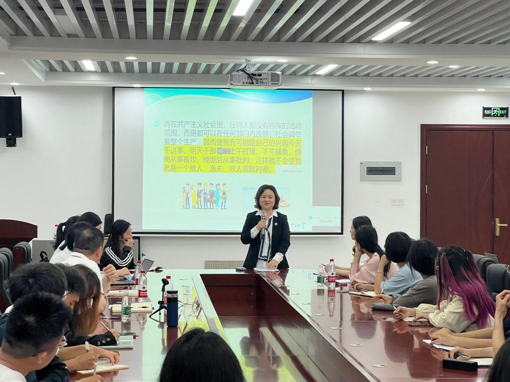 石红梅教授引用《德意志意识形态》中提到的“我有可能随自己的兴趣今天干这事,明天干那事,上午打猎,下午捕鱼,傍晚从事畜牧,晚饭后从事批判”来讨论人的自由,继而指出自由是社会性的,人的自由发展和全面发展是一个相互联系的有机统一体,使同学们对“自由”和“全面”问题有了初步了解。石红梅教授还以“翱翔之鸟”、“人生之圆”、“压舱石”三幅图为例,结合自己的学术成长历程,启发了同学们对于“自由”“全面”问题的思考,勉励大家要充分发挥才能,在有限的生命里发挥无限的可能,乘风破浪,行稳致远。