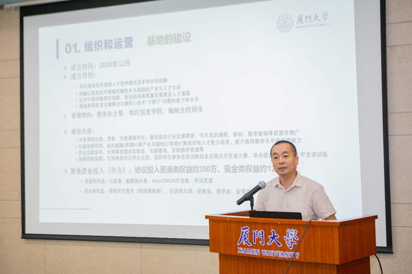 华为公司高校科研与人才发展部部长曹新方、华为公司昇腾生态发展总监廖义祥分别介绍了教育部“智能基座”整体进展及规划、及鲲鹏&昇腾众智计划2.0项目情况。我院廖明宏副院长从课程建设、师资培训,强化学生创新创业、实践能力培养及建设成效等方面介绍“智能基座”项目在厦门大学的落地情况。