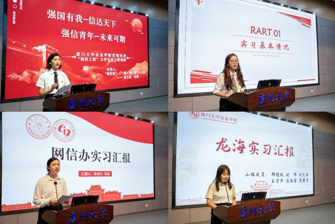 今年暑假,“强信班”一期学员分为四组,深入晋江、龙海、厦门网信办和厦门市中级人民法院等地方和单位进行为期一个月的实习实训。四个小组进行了暑期实习汇报展示,分享心得体会。同学们说,“在实践过程中我更感觉到作为当代青年要沉得下心、砥砺意志,在实践中长真知、长才干。”“要学会从实践中学习,从学习中实践。仅有亲身实践才能知其根本,才会做出想要的成绩。”“困难是每个人成长中的淬炼,要直面困难、克服困难,从中得到从身体到意志的磨练。”“作为新时代的接班人,站在新的历史起点,面对着前所未有的大发展大变革,更要练好内功、提升修养、增强本领,努力成为可堪大用、能担重任的栋梁之才。”