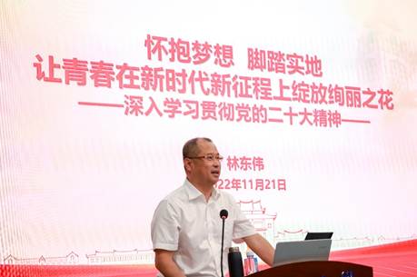 11月21日下午,校党委常务副书记林东伟在翔安校区德旺图书馆报告厅为2022级计算类本科生讲授了题为“怀抱梦想 脚踏实地 让青春在新时代新征程上绽放绚丽之花——深入学习贯彻党的二十大精神”的思政课。