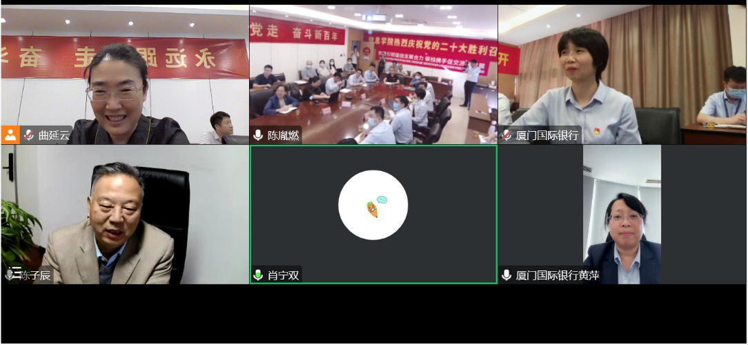 为深入贯彻学习党的二十大精神,发挥高质量党建推动高质量发展的引领作用,11月29日,厦门大学信息学院计算机系教工党支部与国际银行科创中心第三党支部联合举办主题党日活动,活动主题为:“党建引领强信念聚合力,银校携手促交流谋发展”。 教育部直属高校党建工作联络员陈子辰,国际银行科创中心党委副书记黄萍、厦门大学党委组织员兼党建办副主任葛郝锐、厦门大学信息学院党委副书记龙坚毅、国际银行科创中心第三党支部书记徐艳华、厦门大学信息学院计算机科学与技术系教工党支部书记曲延云、以及双方党员代表参加会议。