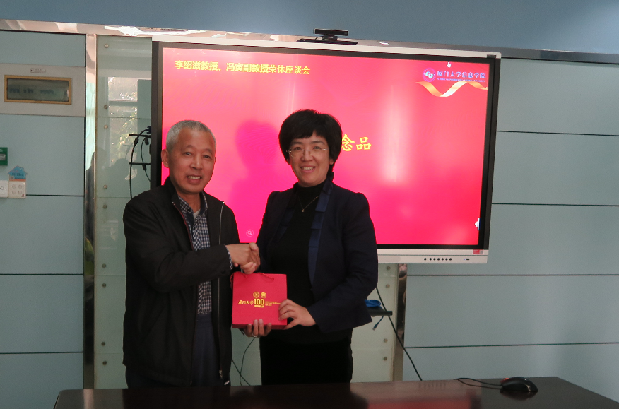 史晓东分别介绍李绍滋和冯寅的学术生涯,以及在厦门大学工作期间所取得的成绩和贡献。李承华代表学校向两位老师颁发感谢信和金质校徽,以感谢两位老师为厦门大学做出的贡献。龙坚毅代表信息学院向两位老师赠送纪念品,感谢二位老师为信息学院学科建设的辛勤付出。江敏代表智能系向两位老师献花。数十位未能来到现场的毕业生也以视频的方式回顾了在厦门大学求学经历,表达对两位老师辛勤培养的感激之情,并对老师表达深深的祝福。
