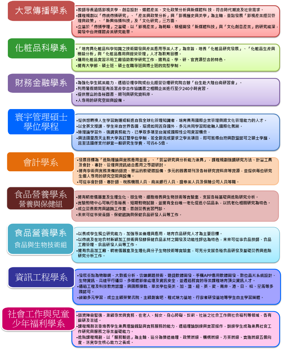 台灣静宜大学碩士班為了讓學生們在研究深造方面有更多元的選擇,2017年招收研究所的科系共有:財務金融學系、食品營養學系食品與生物技術組、食品營養學系營養與保健組、化粧品科學系、會計學系、大眾傳播學系、寰宇管理碩士學位學程、資訊工程學系、社會工作與兒童少年福利學系等九大專業領域,希冀提供更多的就學管道與機會給有意繼續深造的學生們。對於958和211高校來就讀之陸生,第一年提供與學雜費全額獎學金。