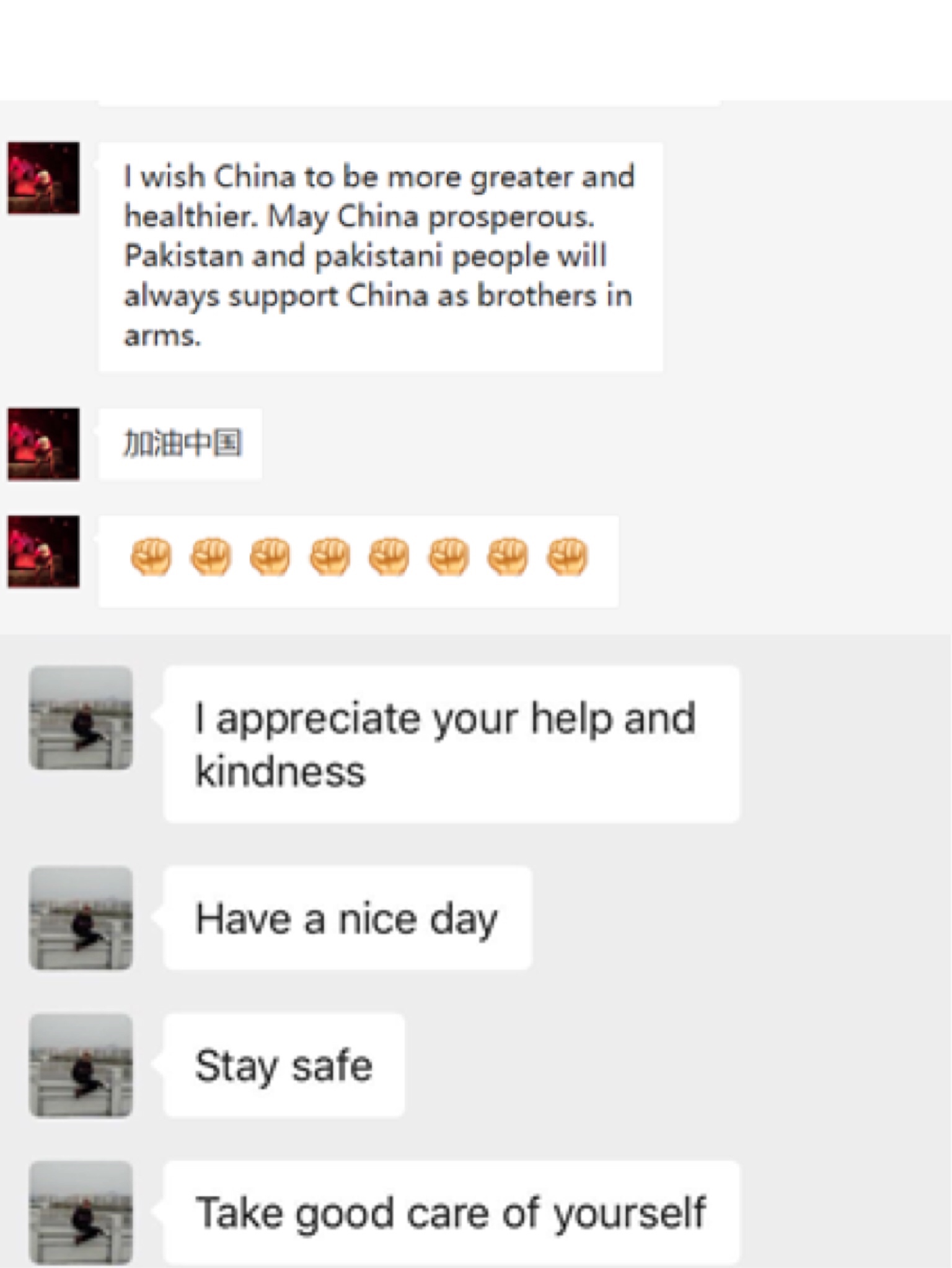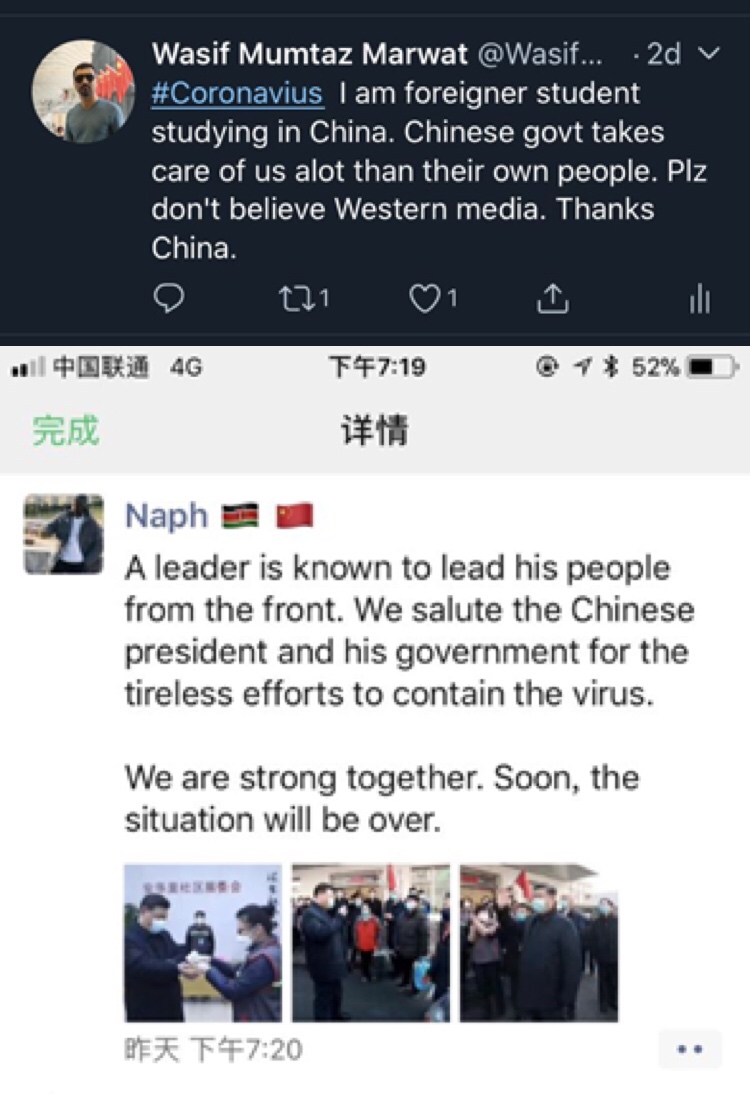 他们的汉语不好,但依旧积极表达,许多海外生自发在微信朋友圈发文,他们向自己的亲人、朋友讲述自己如何受到学校的照顾,以及中国是如何全力以赴抗击疫情,一言一图,真情满满!