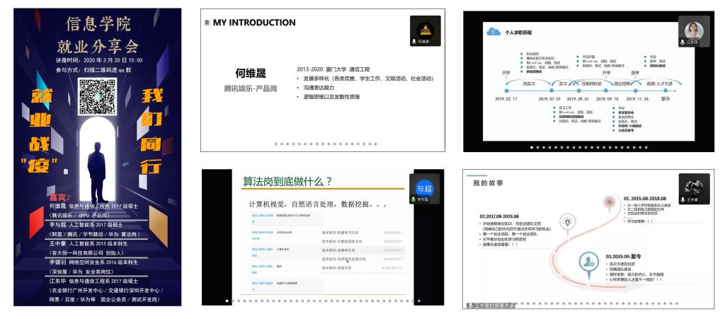 “用心做好云分享”,面对严峻的就业形势,为帮助同学们共克时艰,了解就业前沿,学院于2020年3月20日下午举办了主题为“就业战疫,我们同行”的就业经验线上分享会。会议邀请了五名优秀的同学作为主讲嘉宾,分享会采用腾讯会议在线直播,内容涵盖产品、算法、技术、创业以及国企公务员等多方面的就业创业经验,共有135名毕业生参与了这次分享会。通过优秀就业生身体力行的故事述说与丰富的经验分享,带给同学们很大的鼓舞和启发,为同学解答了未来就业道路上的困惑,明确了就业方向和目标,也为毕业后走上职场之路打下了良好的基础。