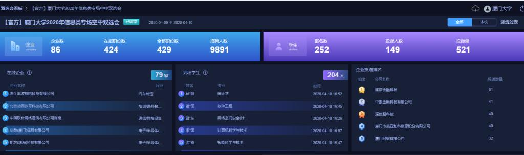 “全心助推云招聘”,为最大限度降低疫情给毕业生就业工作带来的影响,促进毕业生更高质量和更充分就业,除了做好各家企业的云宣讲会宣传,学院于2020年4月9-10日举办“厦门大学2020年信息类专场就业暨实习空中双选会”。本场“空中双选会”与智联招聘合作,全程采用线上互动的形式,为用人单位和毕业生搭建了安全、高效、便捷的在线交流平台。企业在平台上发布职位需求并收取学生简历。学生通过注册报名、填写简历,查看已报名的企业职位信息并完成简历投递。企业则根据简历投递情况与学生在线沟通并进行视频面试。本场双选会应聘企业达86家,为毕业生提供了424个就业及实习职位,多达9891个招聘人数,共有校内外252名毕业生参与线上招聘会,累计投递简历521份。参会单位包括华为技术有限公司,网易计算机系统有限公司,建信金融科技有限责任公司,中银金融科技有限公司,深信服科技股份有限公司等86家优质企业,行业遍布计算机软件、IT服务、银行等多个领域,企业规模庞大,多数为千人及以上规模,企业分布广泛,为毕业生提供了丰富的选择。