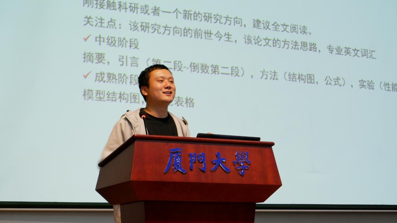 分享会环节中,林元国同学详尽地为同学们介绍了看文献、做科研、发文章三个方面的技巧方法,他强调研究生要有危机感,要严格要求自己,希望大家能够培养兴趣、做一个快乐的科研人。