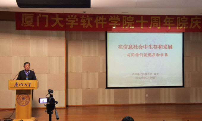 3月16日下午,在漳州校区主楼小报告厅,西安电子科技大学副校长、软件工程研究所所长陈平教授做了题为“在信息社会中生存和发展”的精彩讲座。软件学院副院长曾文华担任主持,辅导员李加冕、刘茜和来自软件学院大一、大二的300多名同学一道聆听了讲座。