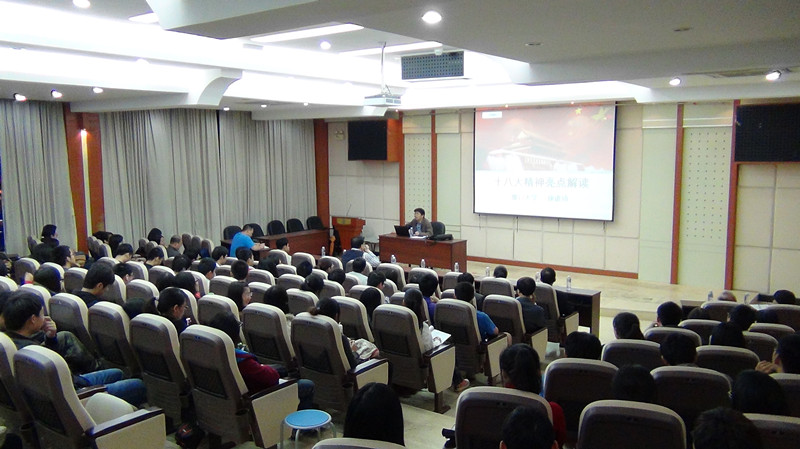 徐教授在讲座中指出,十八大报告对我们中国特色社会主义的认识达到了一个新高度,对发展中国特色社会主义30年来的经验、成就和成果进行了系统深入的阐述,特别是关于中国特色社会主义的三大成果“开辟了中国特色社会主义道路,形成了中国特色社会主义理论体系,确立了中国特色社会主义制度”让我们对发展中国特色社会主义更加自信。随后,徐教授又对十八大报告十个亮点一一剖析,加深了在场师生们对十八大报告新观点的认识和理解。
