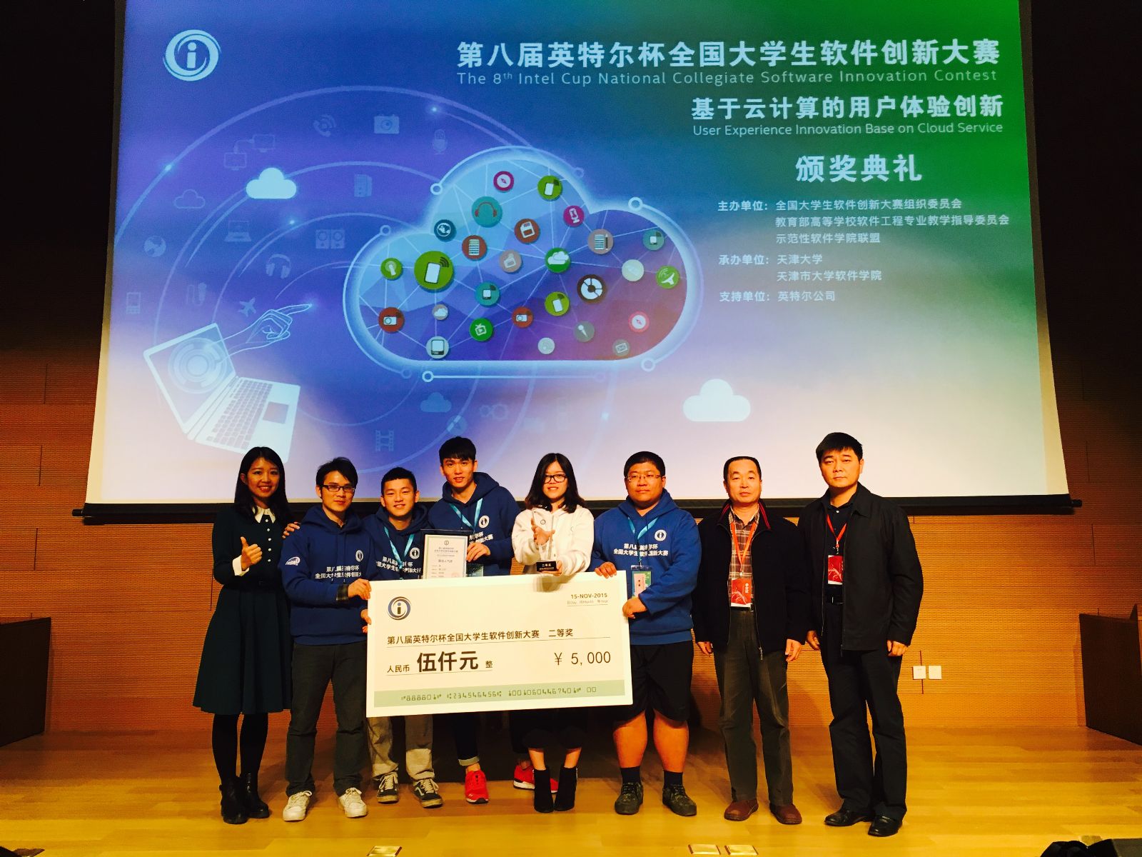 2015年11月15日,由全国大学生软件创新大赛组织委员会、教育部高等学校软件工程专业教学指导委员会、示范性软件学院联盟主办,天津大学软件学院承办、英特尔公司支持的第八届“英特尔杯”全国大学生软件创新大赛在天津大学圆满落幕。我院团队荣获二等奖,院长廖明宏教授出席了颁奖典礼,并为获奖团队颁奖。