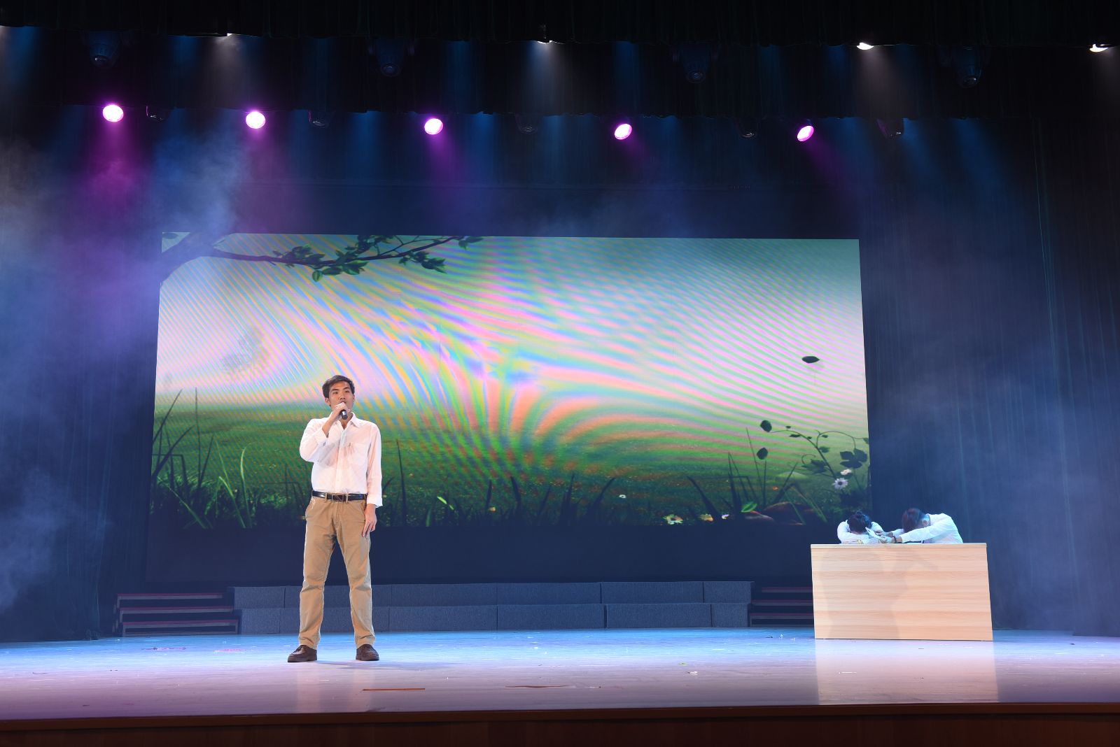 我院教职工表演的歌曲演唱与情景剧表演《人生》压轴出场。节目以三首歌曲为主,李加冕演唱的《同桌的你》表现学生时代青葱岁月的懵懂,刘茜演唱的《如果没有你》表现婚姻中的冲突与温暖,赵江声演唱的《当你老了》表现携手终生、相伴到老的温情。三首歌串联平淡却真挚的情感,带给人以感动,并最终获得优秀奖。由2013级陈嘉钰制作的展示我院女教工风采的视频获得“最佳视频奖”。