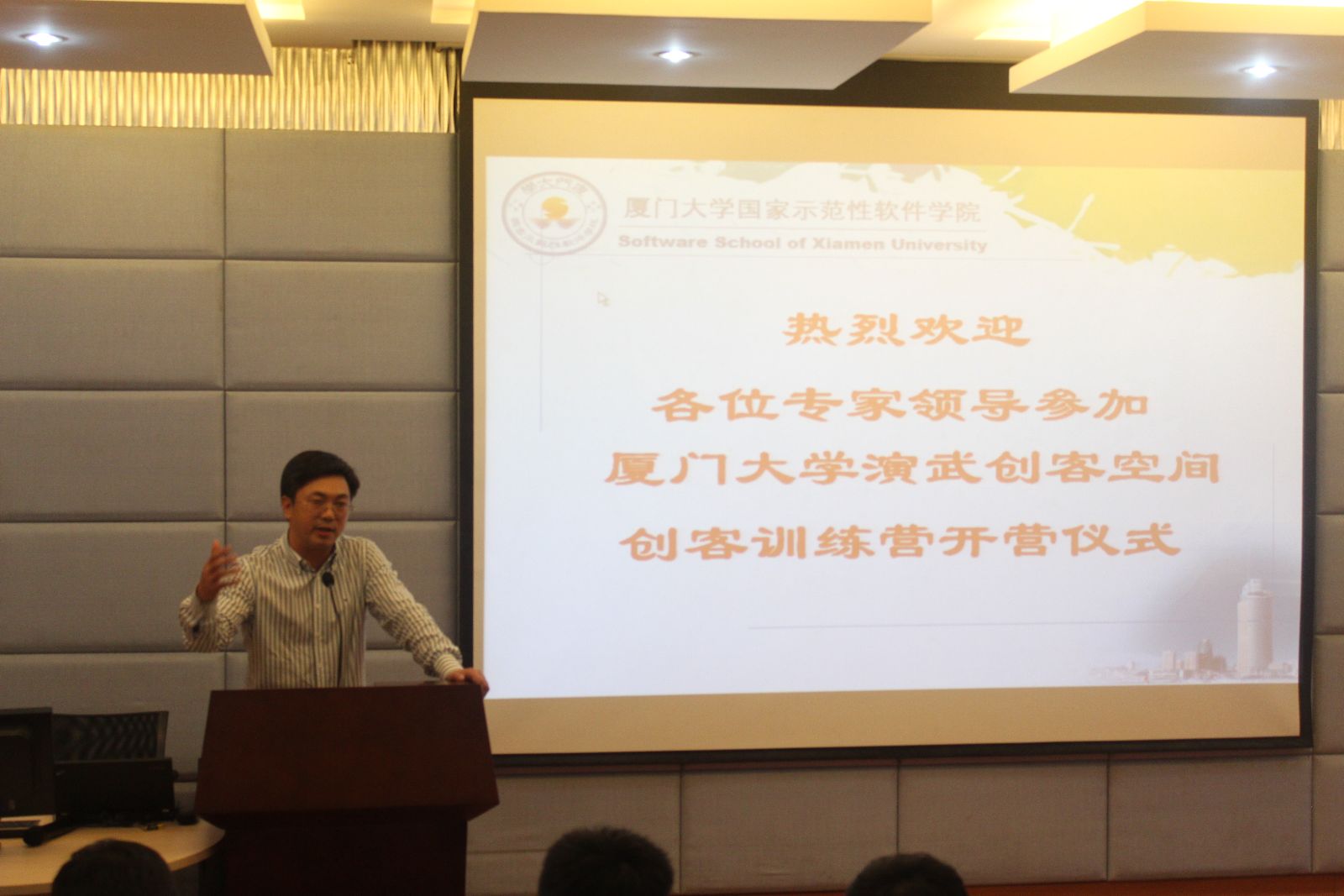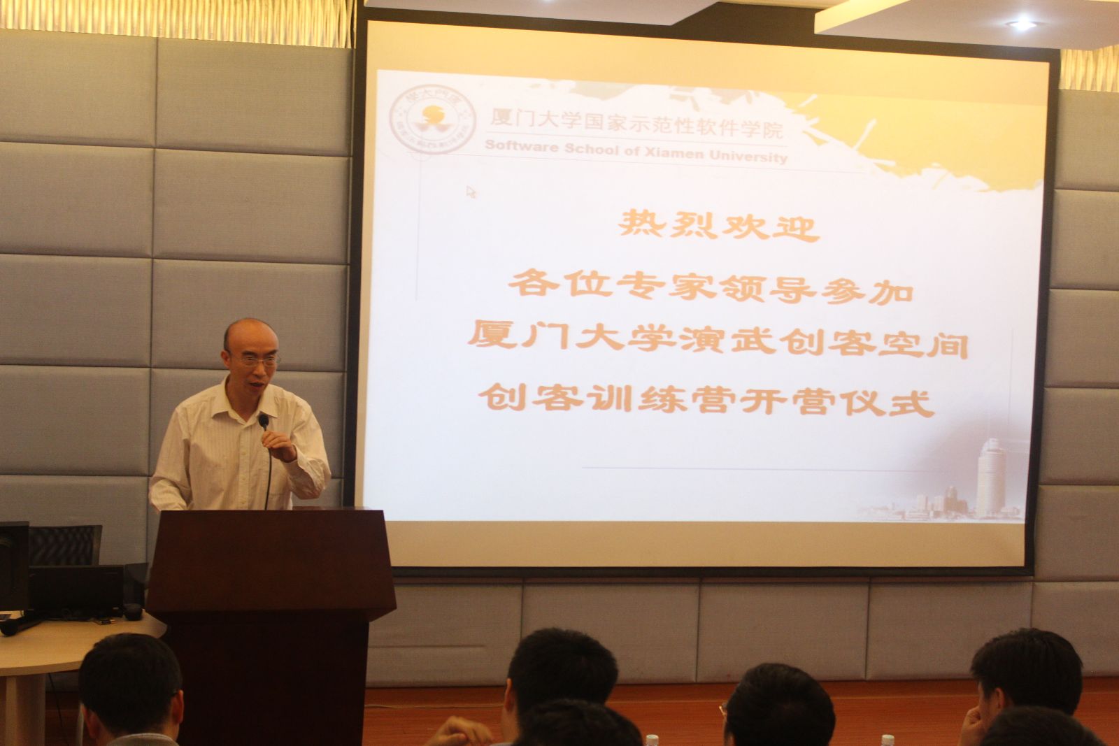 2016年11月12日下午厦门大学演武创客空间创客训练营开营式在海韵科研一路演室顺利举行。厦门大学现代教育技术与实践训练中心主任兼教务处副处长谢火木、思明区科技和信息化局经信科科长林衡、厦门大学学生处就业指导科副科长林智敏、软件学院党委书记董槐林、副院长林坤辉、软件工程系副主任杨律青以及创客导师和学生创客们出席了开营式。会议由林坤辉教授主持。