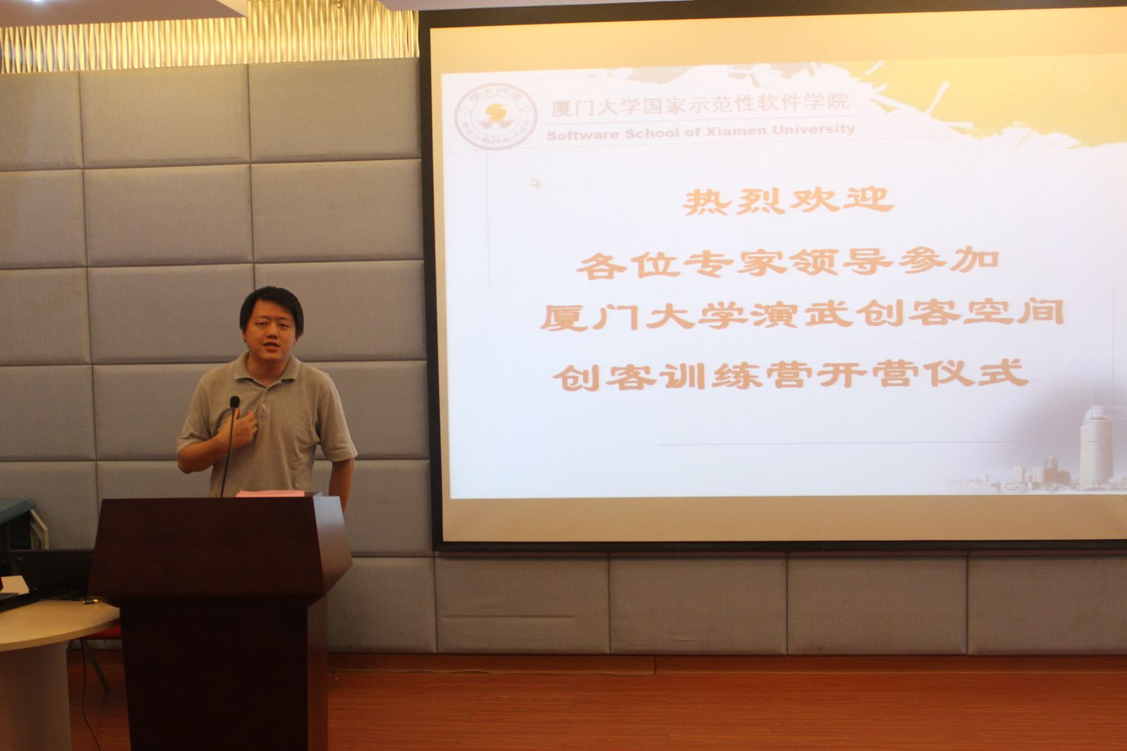 会议伊始,谢火木主任首先致辞。他说,演武创客空间是学校支持建设的第一批创客空间。他认为演武创客空间的建设目标——1. 提供开放的创意与创业实验环境与交流协作平台;2. 成为创新型人才成长和创新项目的孵化器;3. 成为一个投融资和与市场对接的窗口——定位非常准确。他畅谈了厦门大学创新创业的优良传统;又从政策方面强调了学校对于创新创业教育的重视,从资源、人力、经费、平台等角度简要说明了学校对于学生创新的建设力度。他祝愿演武创客空间越办越好。