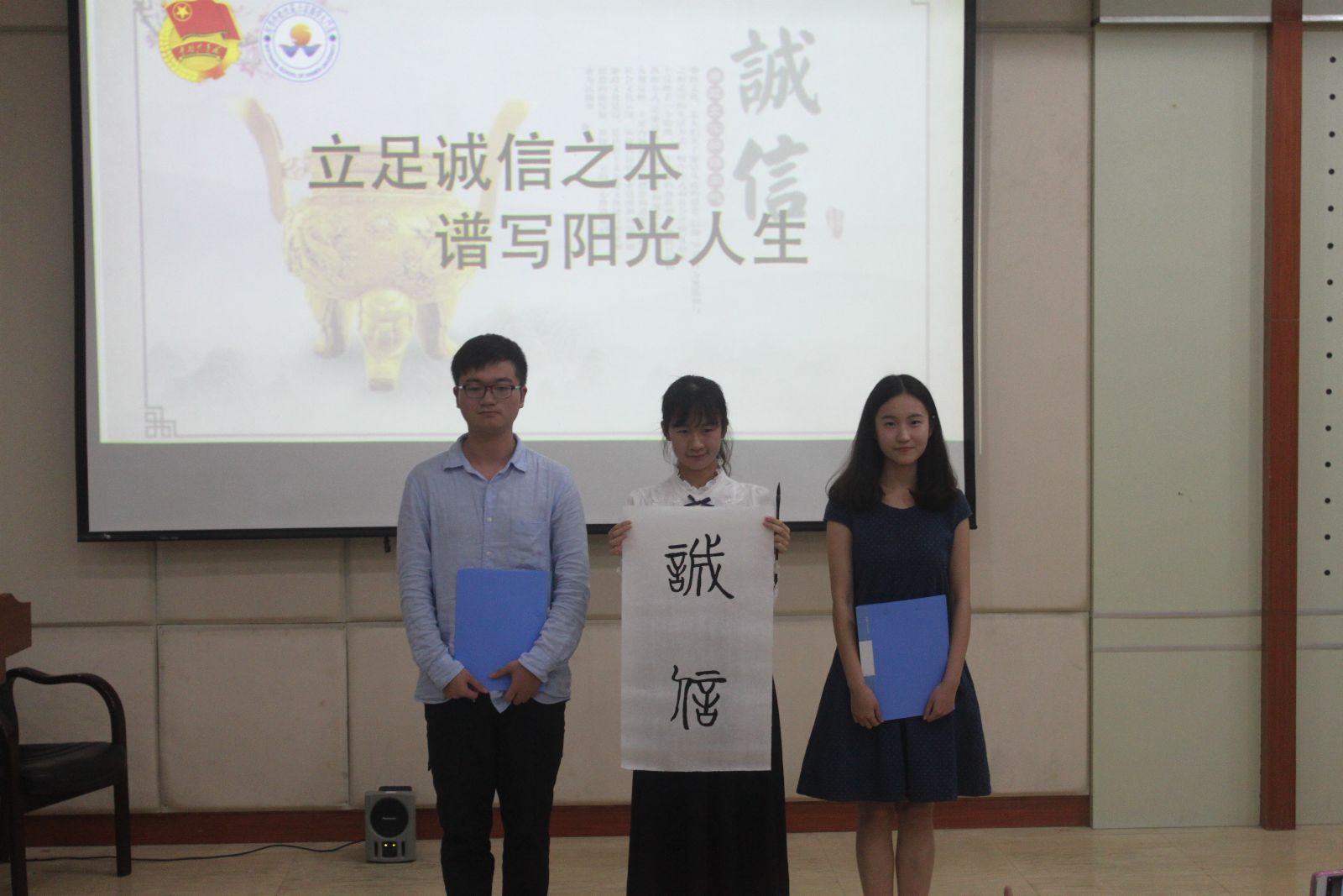 小组代表发言结束后,林欢和罗俊华两位同学为大家带来诗朗诵:诚信之于个人犹如天使的翅膀,一旦失去,则无法飞翔。同时,李锦玉同学现场表演书法写作,诚信二字遒劲有力,刻入同学们心中。随后,主持人苏小芮和宋彤代表团支部向全院同学发出诚信倡议,号召所有同学明礼诚信、恪守承诺、诚信立身。