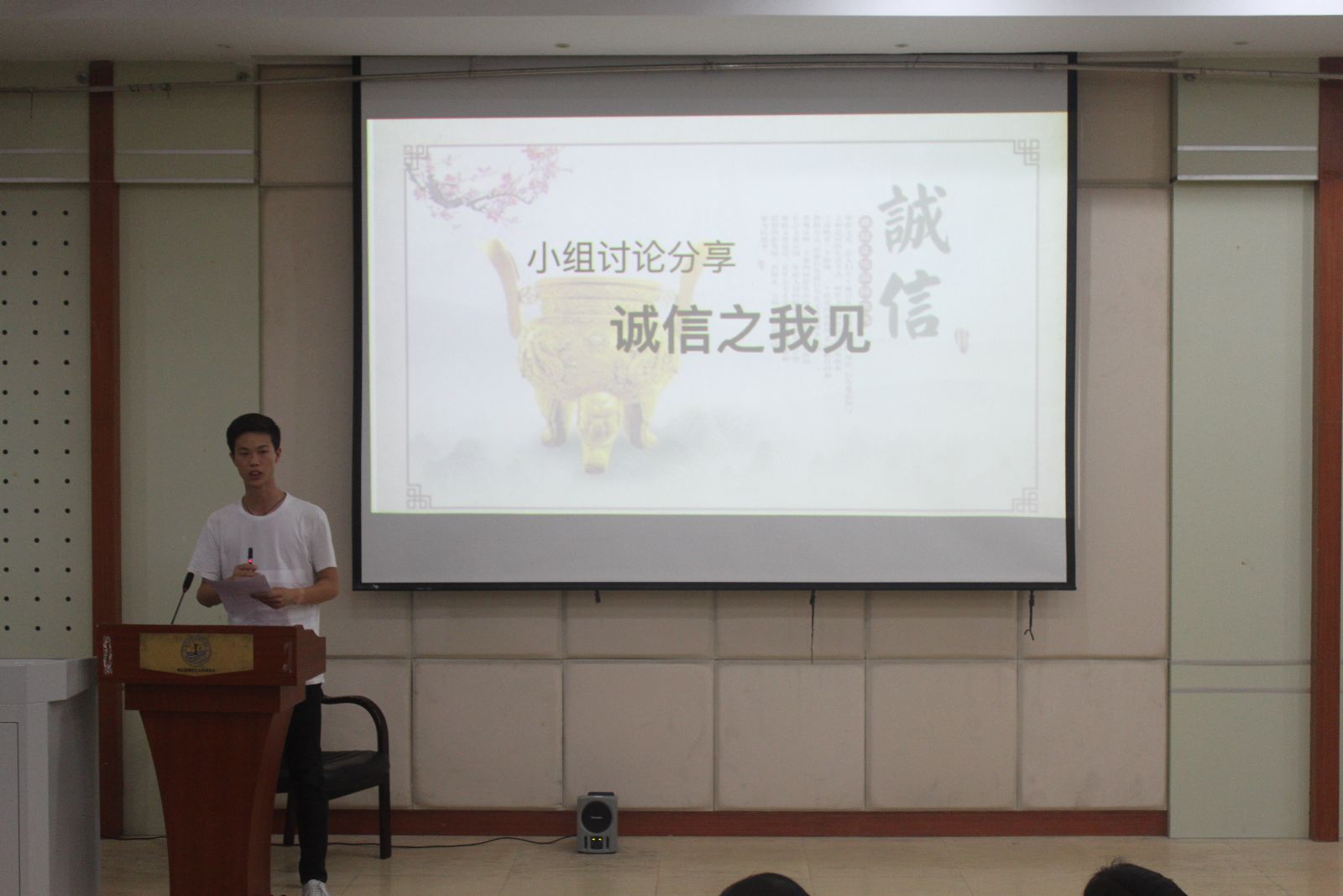 诚信之我见环节则是各小组代表分享对“我们今天为什么要谈诚信”这一话题讨论的结果。第一小组认为诚信是社会主义核心价值观的重要内容,不诚不信一时得利,但却输掉更多,号召每个人都成为“诚信大使”,身体力行;第二小组结合助学贷款中拖欠贷款违背诚信的案例,号召大家将诚信作为人生的底线;第三小组从思想重视和行动落实两个方面发出倡议,大学生应做到不欺人,不自欺,诚信而立;第四小组认为诚信是一种契约精神,无论是考试遵守规定还是上课准时不迟到,都应该履行契约。