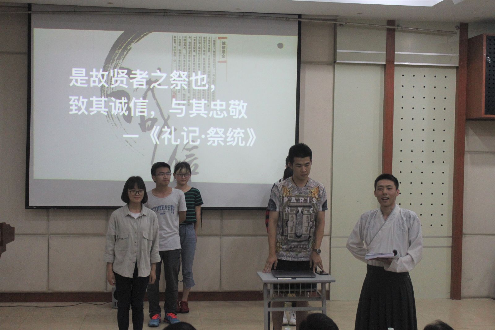 诚信小课堂环节,同学们通过情景剧展示了何谓诚,何谓信:主人公撒谎翘课、抄袭作业,在梦中穿越到古代,跟随先生一起学习了“是故贤者之祭也,致其诚信,与其忠敬”、“诚者,天之道也,思诚者,人之道也”等古语后,认识到自己的不诚信行为并最终悔改。生动的展示让大家对诚信的内涵有了进一步的了解。