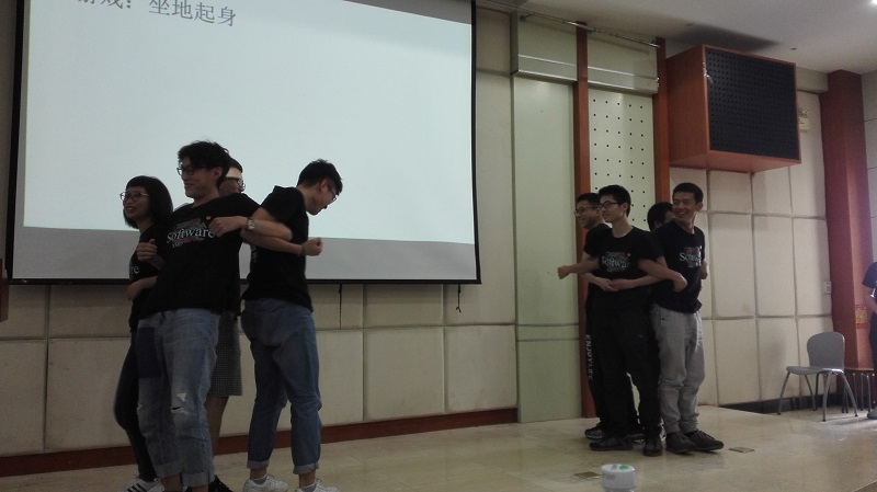 紧接着,第三小组借重庆大学和厦门大学两个优秀宿舍的突出表现,向同学们展示了集体协作的力量。小组通过一个团队协作互动游戏——“坐地起身”,通过多角度的对比展示个人努力与集体合作的差距,形象地向大家说明了团队合作的重要性,使同学们深刻认识到一个拥有较强凝聚力、积极向上精神的班集体,对于班级学风建设具有重要的促进作用,能为班级成员提供一个好的学习环境和氛围,反过来促进班级个人的全面发展。