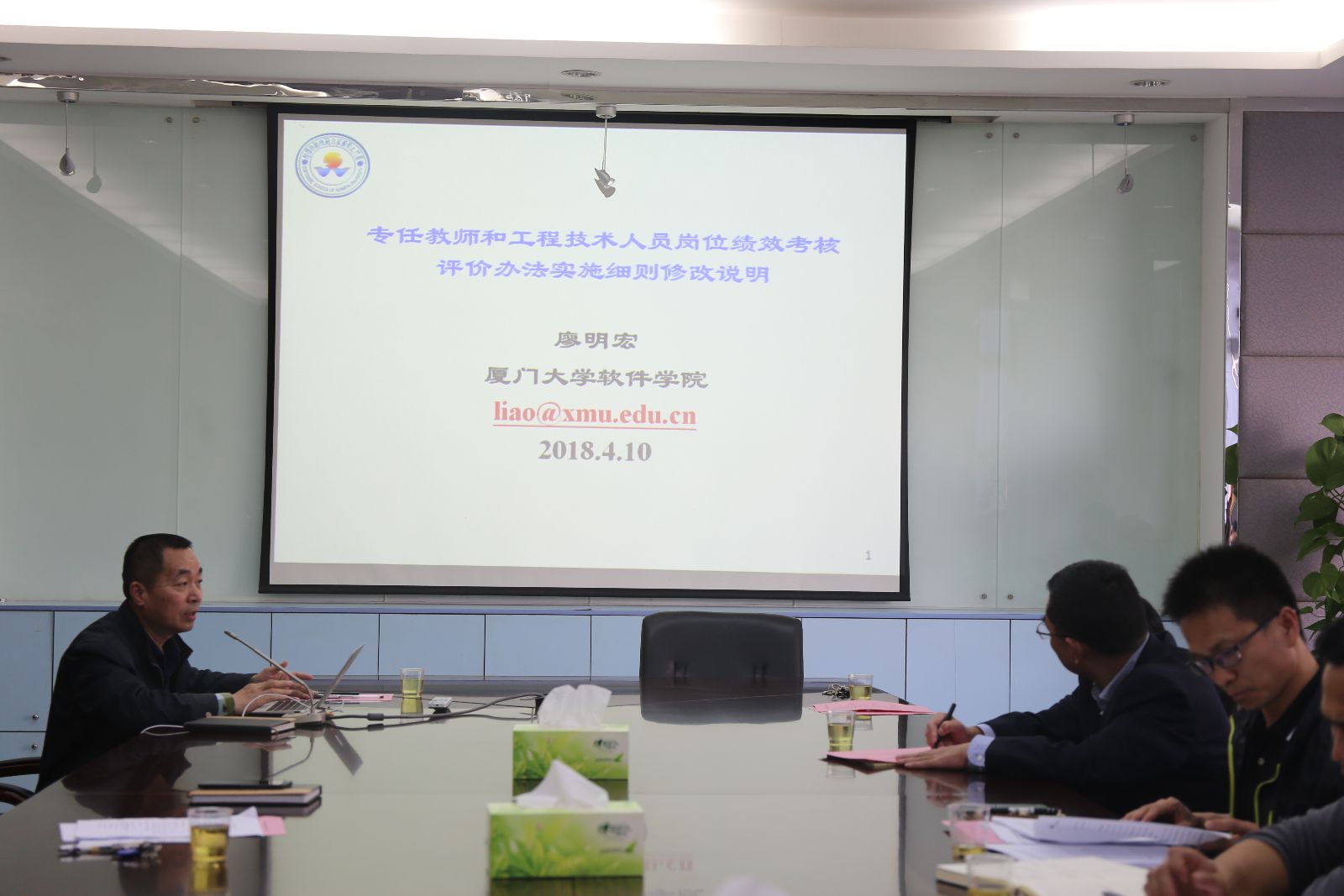 之后廖明宏院长对与教职工切身利益密切相关的专任教师、工程技术人员岗位绩效考核评价办法实施细则以及教师与工程技术人员工作量计算办法做了修订说明。全体教职工分三组对会上内容进行广泛地讨论,大家对学院过去一年的工作表示满意,对2018年的工作充满信心,对专任教师、工程技术人员岗位绩效考核评价办法实施细则以及教师与工程技术人员工作量计算办法的修订方案表示赞同,并提出了一些修改建议。会上,表决一致通过了软件学院专任教师、工程技术人员岗位绩效考核评价办法实施细则以及教师与工程技术人员工作量计算办法的修改稿。