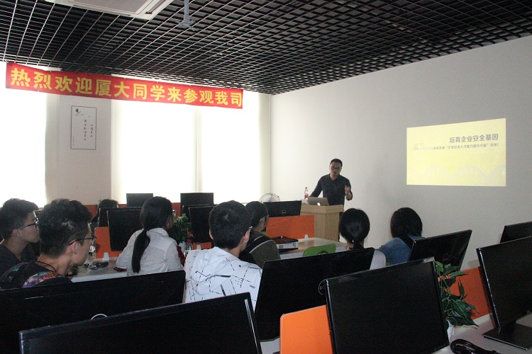 下午两点半,同学们到达公司,王连基总经理热心接待了大家。公司负责人首先播放关了于企业安全信息安全的宣传片,接着为大家进行黑客常用手段的演示实验,大家看得聚精会神,领会颇多。同时,负责人也说明了未来网络安全的发展方向,同学们认真听讲并提出问题,积极互动。随后,王总带同学们参观了公司办公区,程序员们在聚精会神地工作。