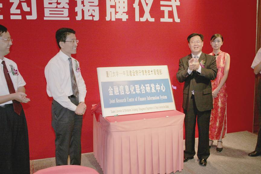 2005年10月18日,中国建设银行股份有限公司与厦门大学技术合作签约暨揭牌仪式在厦门顺利举行,厦门市政府办公厅林守章副秘书长、厦门市信息产业局付鹏副局长、厦门大学朱崇实校长、总行信息技术管理部张益民总经理、王申科副总经理、建行厦门市分行彭洪明行长、生柳荣副行长等市政府嘉宾以及合作方领导及代表出席了签约暨揭牌仪式。此举对于进一步优化与推广校企合作的研究成果,催生更多的研究方向,建立长期、稳定、互利的合作关系,意义深远。同时为厦门高新科技成果创新、储备科技人才、吸引国内外知名IT企业入驻厦门,促进厦门软件产业的发展将带来积极影响。