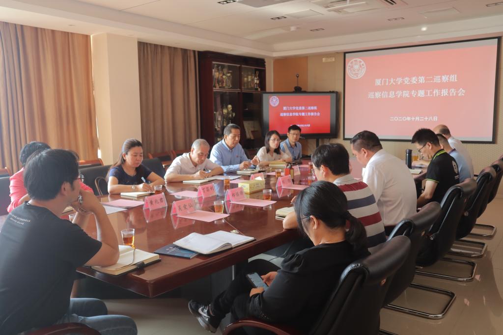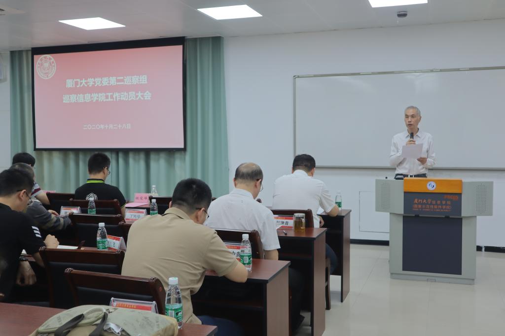 根据校党委统一部署,校党委第二巡察组进驻我院开展为期一个月左右的巡察工作。2020年10月28日上午,厦门大学党委第二巡察组巡察信息学院工作动员大会在海韵园行政楼A201会议室召开。校纪委副书记、纪委办主任、巡察办主任林金枝,第二巡察组组长叶鹏飞,副组长黄定基,组员丁昌利、黄兆君、张晗、陈建胜,联络员郑建斌、刘黛茜出席大会。大会由学院党委书记刘弢主持,学院党政领导班子成员、全体在职教职工和退休教职工代表参加动员大会。