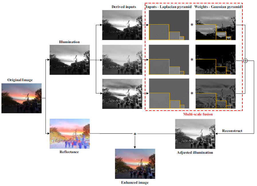 获奖论文发表于2016年12月,受到了国家自然科学基金项目资助。该论文针对单幅图像增强领域内方法的难点和空缺,提出了一种基于融合思想的弱光照图像增强方法,很好地弥补了传统方法仅专注增强图像单一特征的不足。论文框架如上图所示,该方法采用图像金字塔分解技术,将多种经典图像增强算法融合,有效地取长补短,使增强后的图像能够同时克服对细节增强、对比度提升和主观感知效果等方面都兼顾的难题。同时,该方法的计算复杂度较低,易于实现,在多个指标上均能取得State-of-the-art的性能,具有相当的实际应用价值。此外,该论文也受到了领域内包括NeurIPs等顶级会议和期刊的大范围关注。