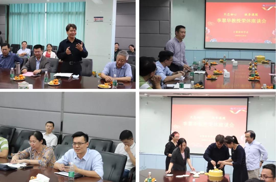 厦门大学计算机系李翠华教授的荣休座谈会于2020年11月9日在信息学院行政楼A306会议室举行。人事处柯自聪科长、信息学院领导王程副院长、龙坚毅副书记、计算机系主任王菡子教授、副系主任刘向荣教授、系党支部书记曲延云教授、系工会程明教授,以及计算机系二十余位教师和四位学生代表参加了荣休座谈会,会议由计算机系主任王菡子教授主持。