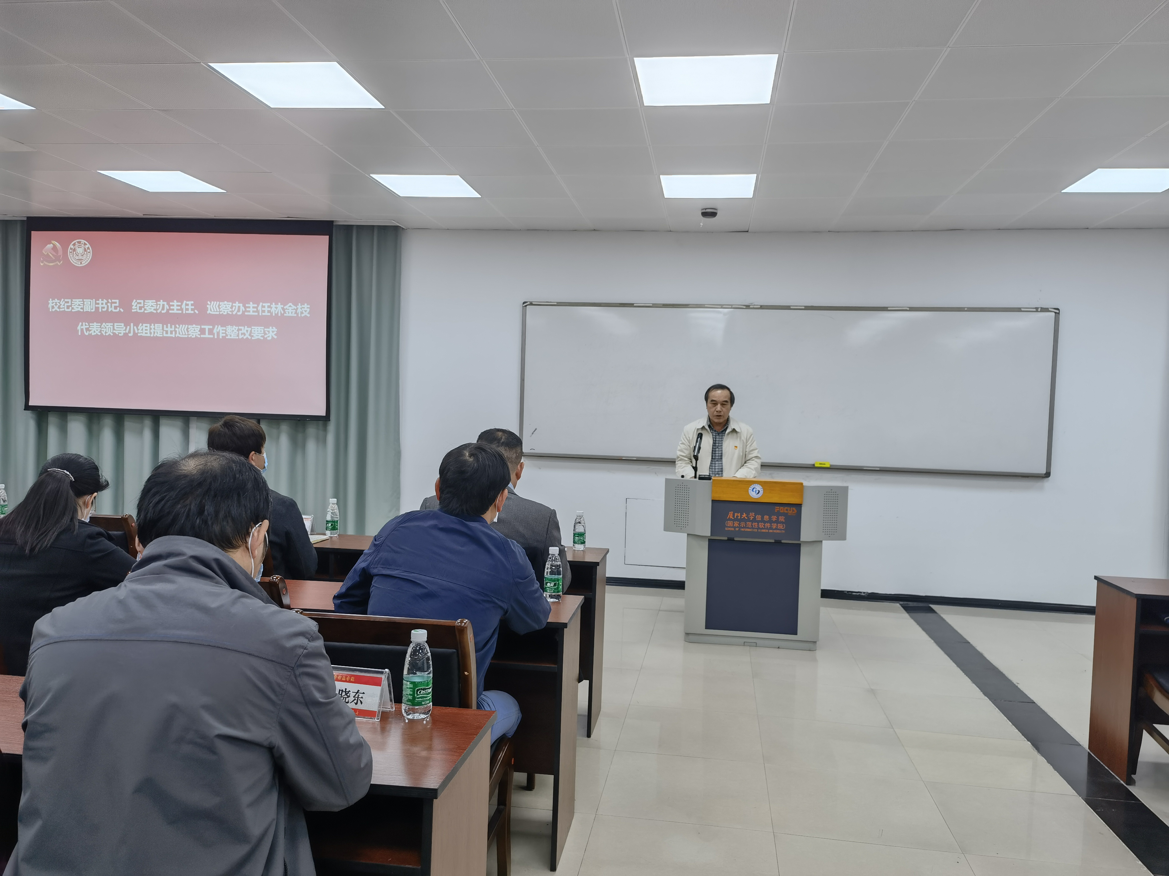 叶鹏飞代表第二巡察组向学院党政主要领导和全体教职工进行了反馈。总体上看,学院党委能够以习近平新时代中国特色社会主义思想为指导,认真贯彻落实党的十九大和十九届二中、三中、四中全会精神,增强“四个意识”,坚定“四个自信”,做到“两个维护”,推动全面从严治党各项任务贯彻落实。同时发现存在薄弱环节:党委的政治核心作用发挥还不够、领导班子履职尽责能力的力度需要进一步提升、主动占领宣传阵地意识不够强、师德师风的长效机制研究较少、自觉履行“一岗双责”的意识还需加强、学院纪检监督压力传导不够到位、党员教育管理工作有待进一步提升等。希望学院党委针对存在的问题,加强政治建设,强化领导班子成员“一岗双责”意识,丰富基层党建活动载体,进一步发挥党委引领学院发展的重要作用。
