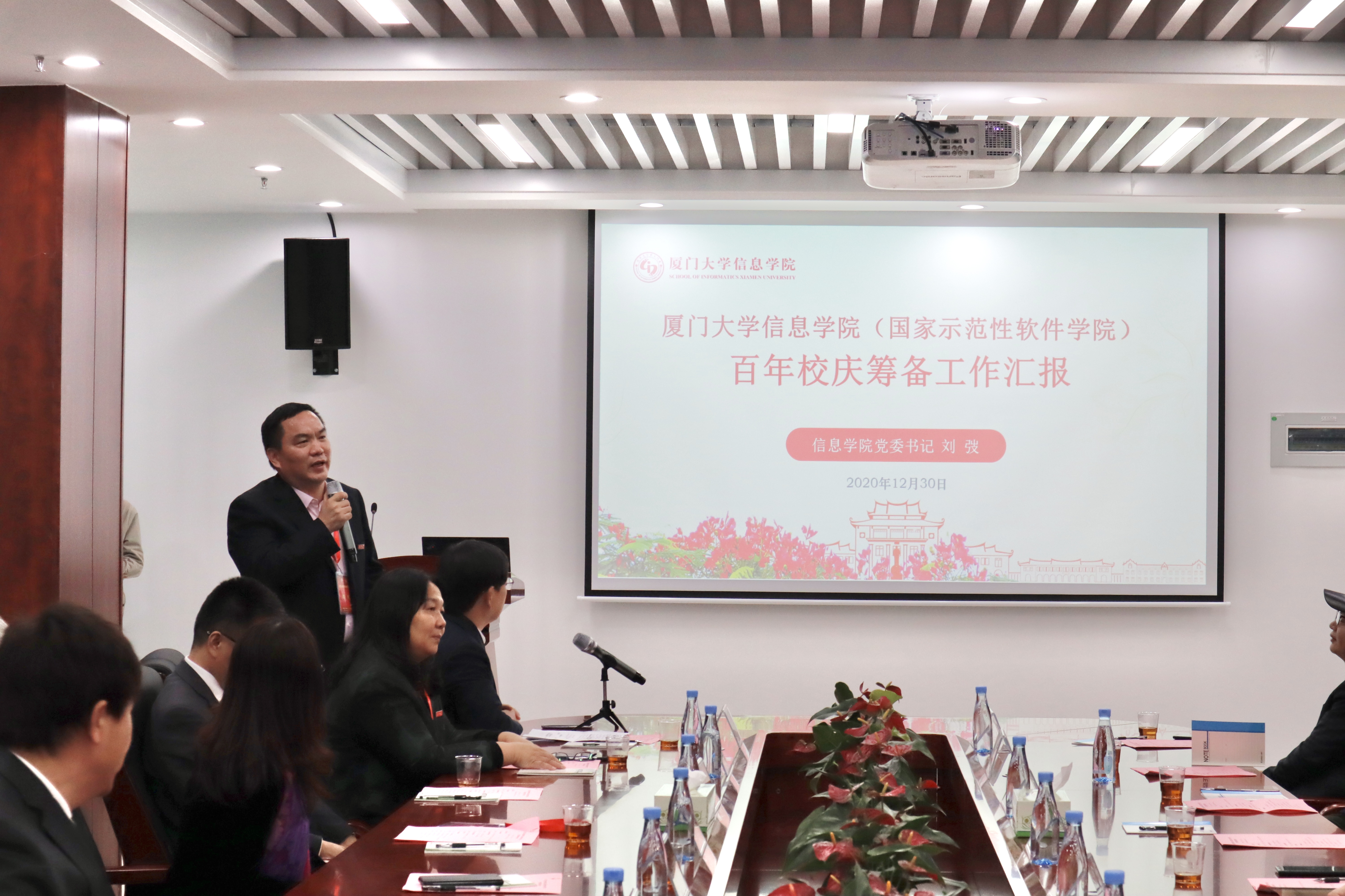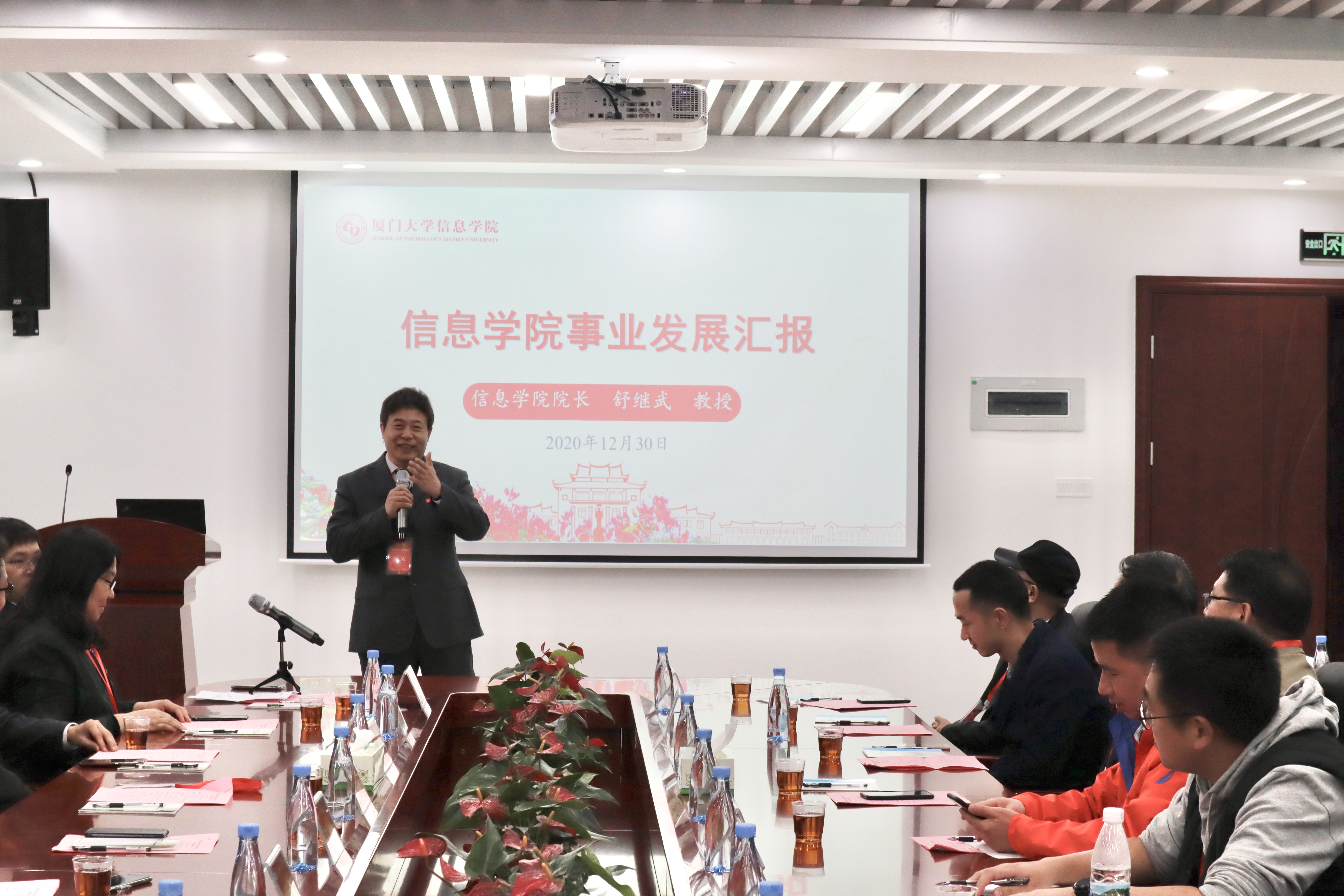 12月30日下午,信息学院在翔安校区新院址行政楼一楼会议室举办校友恳谈会,原厦门大学常务副校长、厦门大学校友总会荣誉理事潘世墨,厦门大学校友总会秘书处副秘书长陈玲,厦门大学翔安校区管委会副主任黄宇霞,厦门大学继续教育学院院长夏侯建兵,原信息科学与技术学院院长、原软件学院首任院长周昌乐,原软件学院副院长林坤辉,信息学院院长舒继武,信息学院党委书记刘弢及全体党政领导班子,信息学院教师代表与来自全国各地的校友代表参加,信息学院党委副书记郑镇锋主持会议。