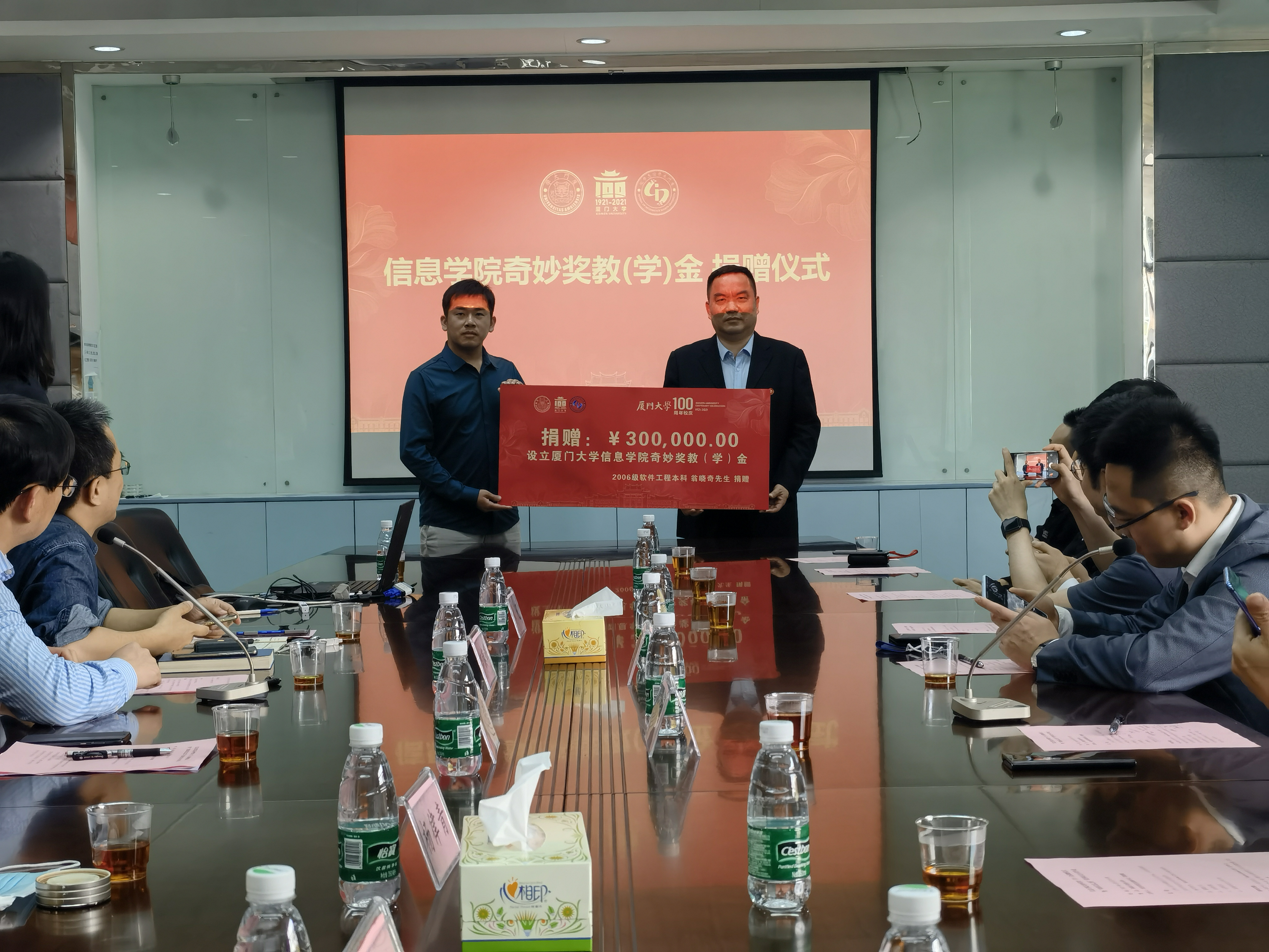 2021年4月5日下午15时,信息学院“奇妙奖教(学)金”捐赠仪式暨“我的信息之路”优秀校友分享沙龙于海韵行政楼A306举行。06级软件工程系校友、Huobi Global CEO翁晓奇,06级机电系校友、厦门建发金属有限公司总经理助理田龙,学院党委书记刘弢,学院党委副书记郑镇锋,软件工程系主任杨律青教授、软件工程系副主任刘昆宏教授、计算机科学系杨晨晖教授、软件工程系林凡副教授、团委副书记刘茜,辅导员蔡婧蓉以及信息学院院友、师生代表出席活动。捐赠仪式由学院党委副书记郑镇锋主持。