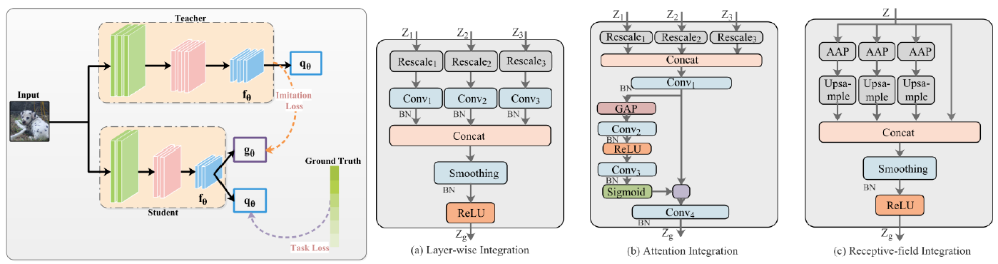 本文的第一作者是信息学院计算机科学与技术系2018级硕士生裴玉龙,信息学院计算机科学与技术系曲延云教授与复旦大学张军平教授是本文的共同通讯作者。本文针对知识蒸馏中的师生差异问题提出了一种有效的蒸馏方法。该方法以理查森外推法为理论指导,通过学生网络的自提升来解决师生差异问题。一方面,文章设计了几种简单高效的特征集成模块来增强学生特征的可判别性,理论上提高了收敛阶。另一方面,文章设计了一种易操作的自蒸馏策略来稳定训练过程、提升训练效果,不需要额外前向传播和内存占用。该方法在不改变学生网络本身、不增加训练和推理时间的前提下大大提升了知识蒸馏的效果。