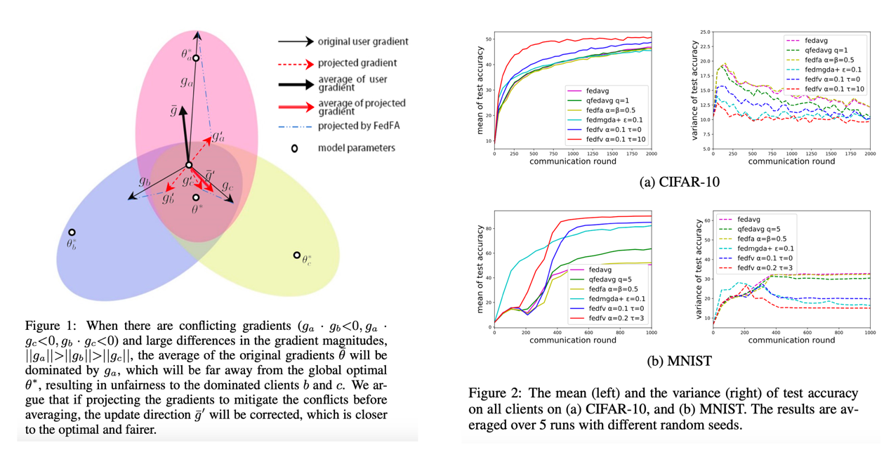 本文的第一作者是信息学院计算机科学与技术系2020级硕士生王铮,通讯作者是信息学院计算机科学与技术系范晓亮高级工程师。本文提出一种基于梯度投影的联邦学习公平性算法(federated fair averaging,简称FedFV)。FedFV探索性地揭示了造成联邦学习公平性的根源性因素:大尺度的梯度矛盾差异。该方法充分考虑了不同用户数据集之间的分布差异以及网络状态不稳定带来的掉线挑战,故能让服务器得到一个更公平、更准确高效的模型。