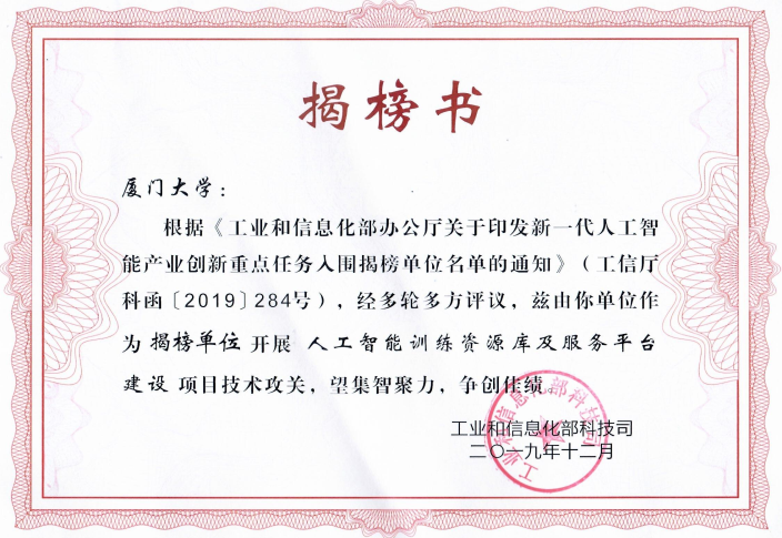 2021年4月19日,中华人民共和国工业和信息化部发布“新一代人工智能产业创新重点任务揭榜优胜单位”,厦门大学作为仅有的两所高校成功晋级。“揭榜优胜单位”是工信部对遴选出的揭榜单位经实地考察、专家评议和第三方专业机构测评等多维度评价,优中选优选拔出来的单位。