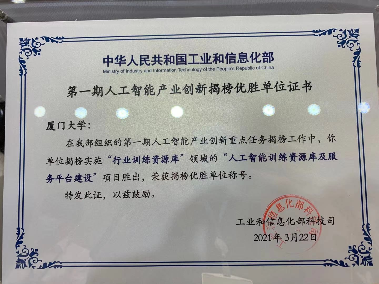 图2 项目“人工智能训练资源库及服务平台建设”在工业和信息化部组织的第一期人工智能产业创新重点任务揭榜工作中胜出,厦门大学荣获揭榜优胜单位称号