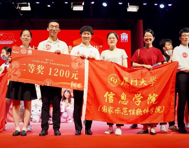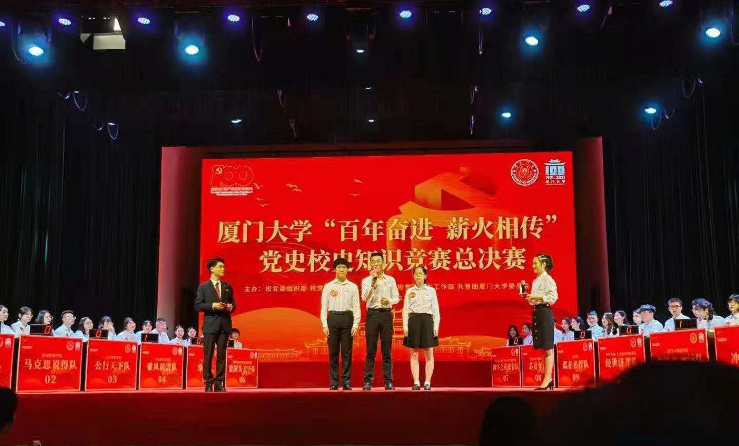 5月21日晚,厦门大学“百年奋进 薪火相传”党史校史知识竞赛总决赛在建南大会堂举行。经过线上答题初试、校级笔试选拔、现场总决赛的激烈角逐,由本科生第2党支部党员刘明辉、何幕,本科生第4党支部党员陈金灵组成的“冲冠军队”从全校一百多支参赛队伍中脱颖而出,斩获亚军!