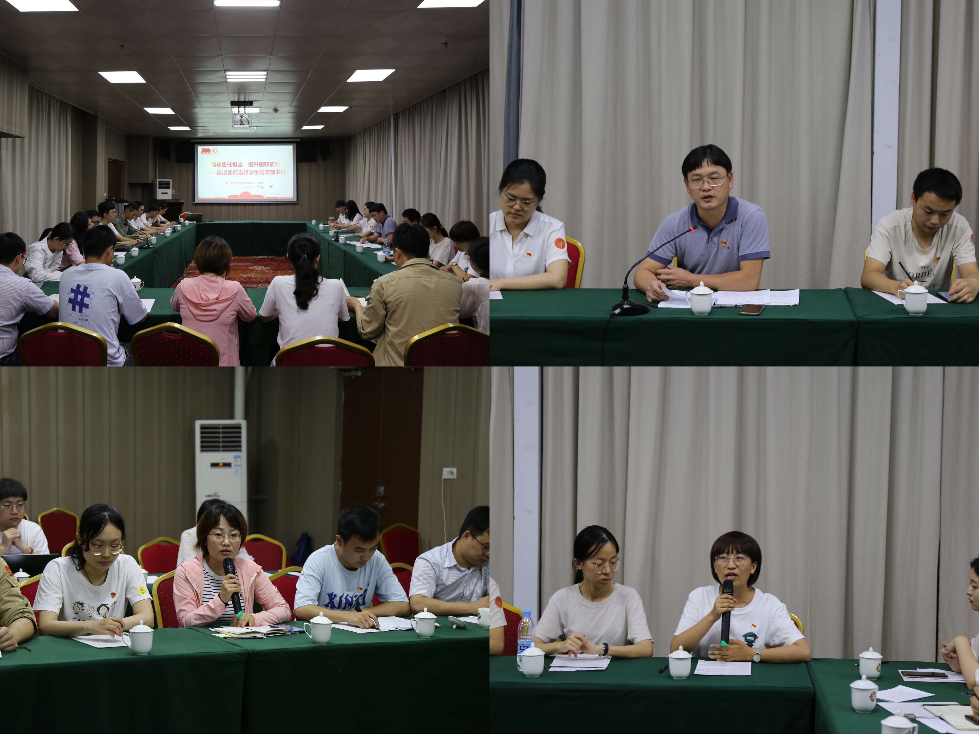5月29日晚,全体党员同志们在长汀宾馆开展专题学习,学院党委副书记郑镇锋作以《强化责任担当,提升履职能力——谈谈如何当好学生党支部书记》为题的主题党课。郑镇锋副书记结合党的十八大以来高校基层党组织工作的方向和任务,向学院学生党支部书记提出“讲政治、懂规范、能作为”三个方面的要求,要求党支部书记们不断提升政治素质,加强标准化建设,掌握群众工作本领,通过积极主动学习,坚定理想信念,准确把握党的路线、方针和政策,结合支部工作的实际,真正实现“七个有力”,推动新时代高校党建有新担当、新作为、新气象。学生党支部书记主题沙龙随后举行,同志们针对党史学习教育、党支部建设、主题党课以及本次现场教学活动展开了热烈的讨论,畅谈学习体会。