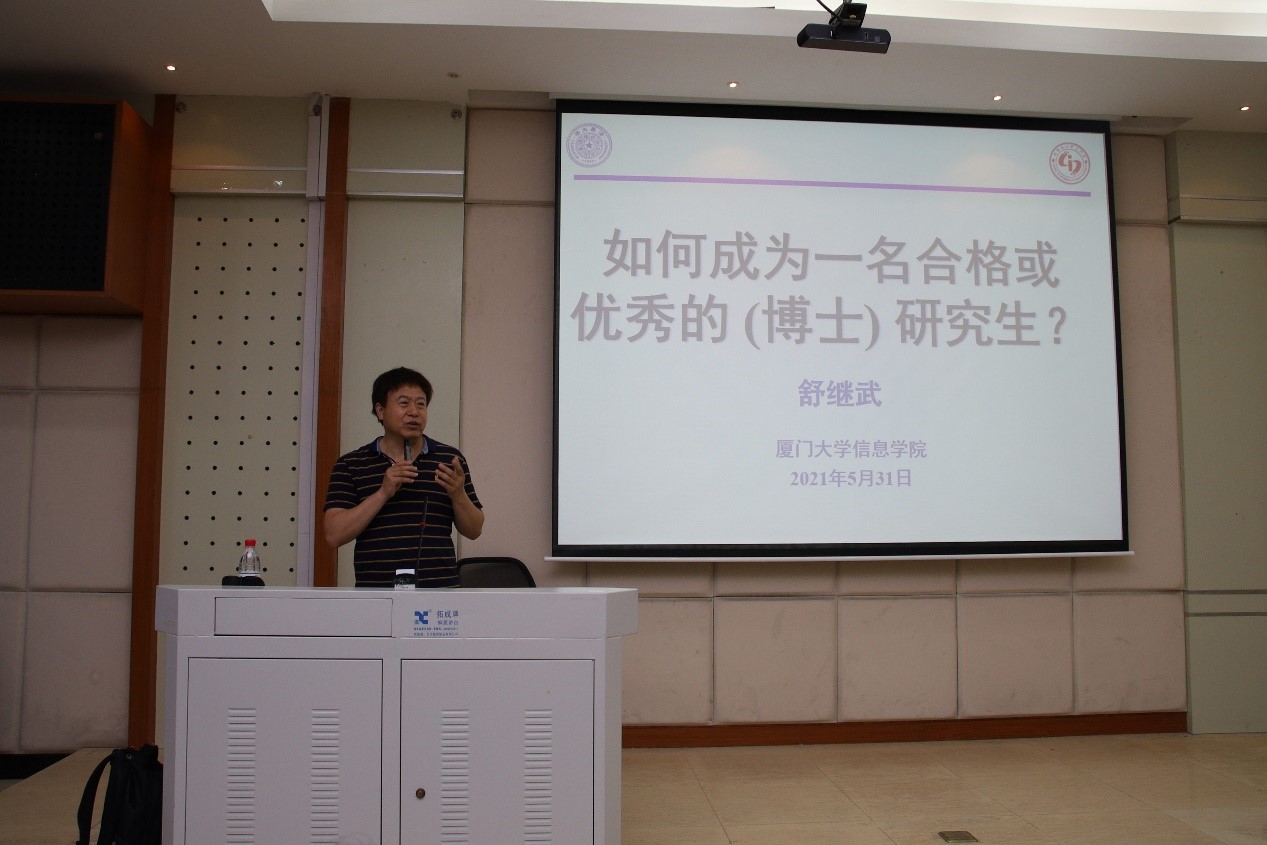 2021531日下午4:00,信息学院舒继武院长在海韵教学楼504教室为全院研究生带来海韵学术文化节名师讲坛的第二场讲座,本次讲座的主题为《如何成为一名合格或优秀的(博士)研究生》。院党委副书记龙坚毅、团委副书记黄艺明和百余名研究生参加了本次活动。