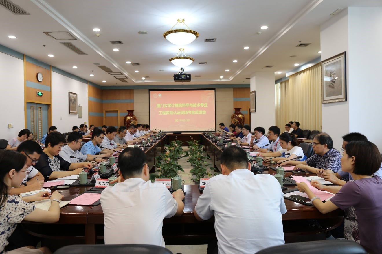6月11日下午,考查组专家意见反馈会在颂恩楼215会议室举行。我校副校长周大旺教授、招生办主任刘艳杰、教务处、学校办公室、学生工作部(处)等职能部门负责人、信息学院党政班子、教师代表等参加了反馈会。会上,考查组组长王宽全教授向我校反馈考查总体情况。考查组认为我校各类教学资源丰富、实验室管理规范、用人单位对毕业生评价高、在校生对教师认可度高、教师对工程认证理念理解到位,教学工作有特色,厦门大学计算机科学技术与技术专业已经建立了OBE教学模式,达到了工程教育专业认证的要求。但是,在定期评价和修订培养目标,毕业生跟踪反馈和相关数据的分析利用,解决复杂工程问题能力培养等方面还存在不足。专家刘贵松教授反馈了加强新生研究方向指导、利用各类资源围绕新技术加快新平台建设、优化教师分类评价体系、课程评价机制、注重学生培养全过程管理等问题,请学校和学院对专业建设给予持续关注和支持。专家林雪纲总经理反馈了加强学生代码和工程能力的培养、加快对新技术的实验条件投入、量化教学业绩评定等方面意见。