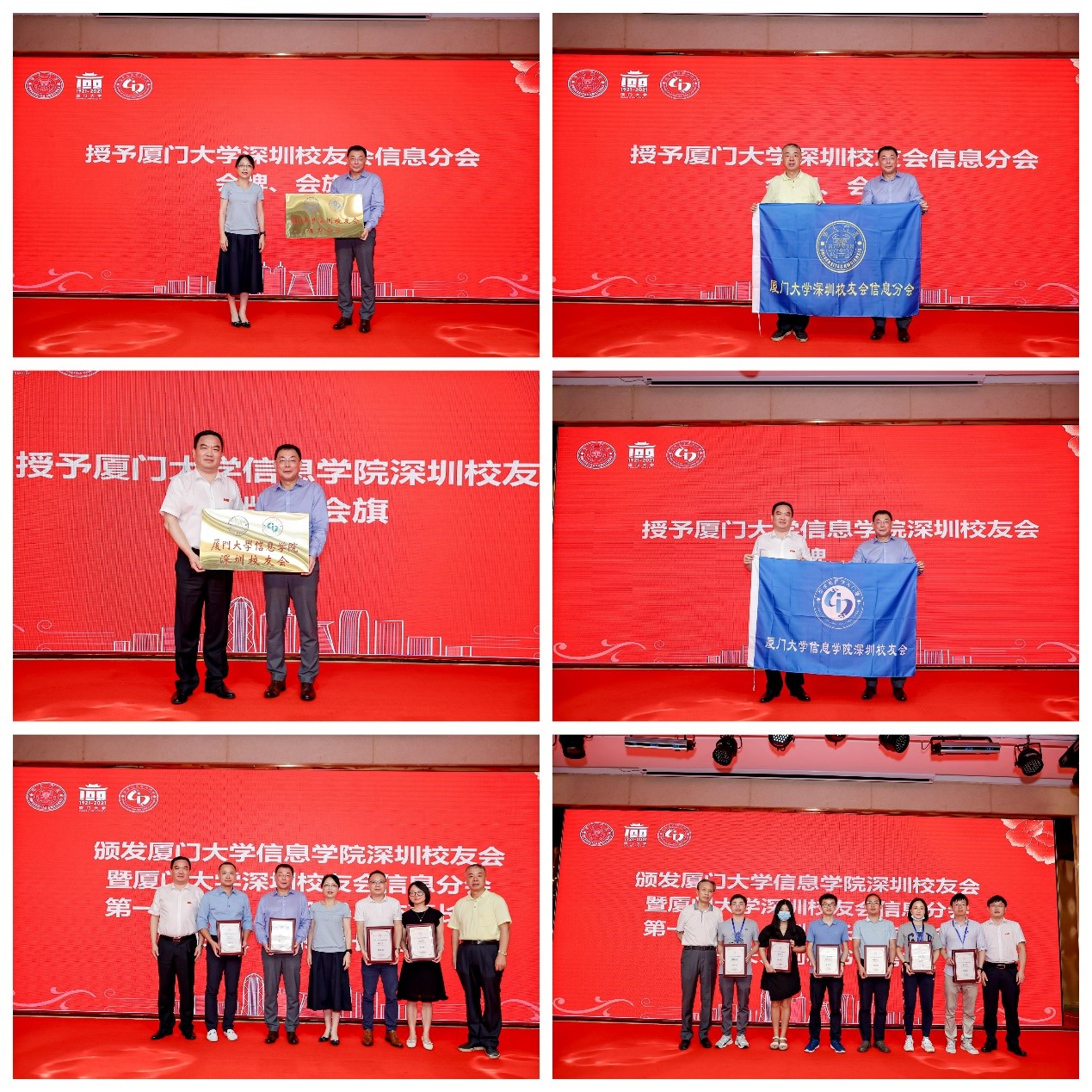 刘弢书记、孙小荔理事长、李贵根副理事长向首任会长田卫东授予厦门大学深圳校友会信息分会会牌、会旗和厦门大学信息学院深圳校友会会牌、会旗,共同为会长、副会长颁发聘书。郑镇锋副书记、王卫华理事共同为信息分会监事长、秘书长及副秘书长颁发聘书。
