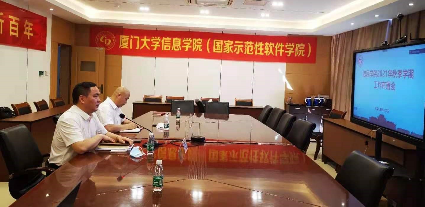 2021年9月27日下午,信息学院召开2021年秋季学期工作布置会。因疫情防控工作需要,会议在行政楼C610会议室设立主会场,党委书记、院长、办公室主任在主会场参会,其他教职工通过视频参加会议。会议由刘弢书记主持。