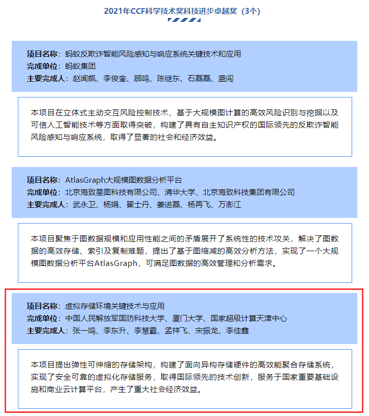 2021年10月14日,中国计算机学会公布了“CCF科学技术奖”的评选结果。厦门大学信息学院张一鸣教授主导的项目“虚拟存储环境关键技术与应用”获得2021年度“CCF科学技术奖科技进步卓越奖”。