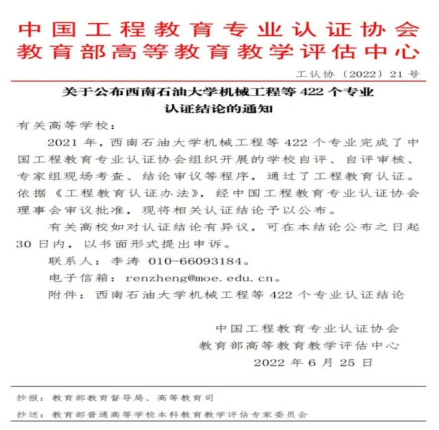 2022年6月25日,中国工程教育专业认证协会、教育部高等教育教学评估中心《关于公布西南石油大学机械工程等422个专业认证结论的通知》(工认协〔2022〕21号)公布了2021年工程教育专业认证结论。厦门大学计算机科学与技术专业通过工程教育认证,有效期为2022年1月至2027年12月。