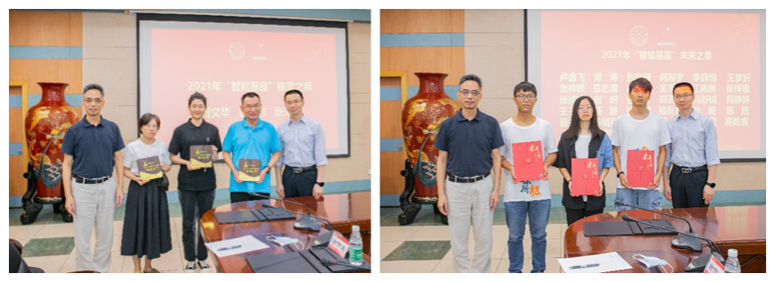会上,周大旺、熊彦为获得2021智能基座栋梁之师的教师代表、未来之星的学生代表颁奖,并为厦门大学软件工程课程群虚拟教研室揭牌。基地优秀教师代表、学生代表进行经验分享。