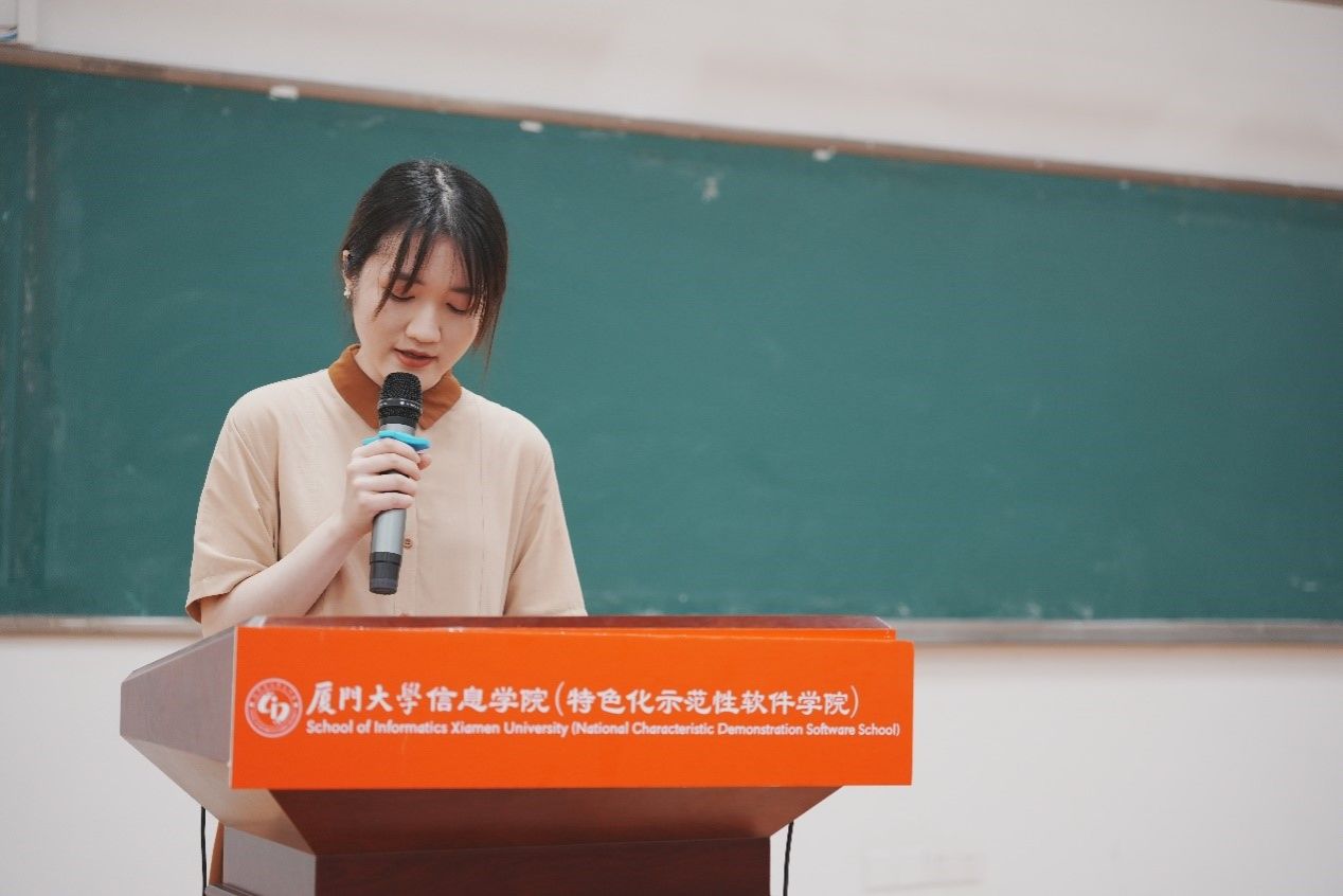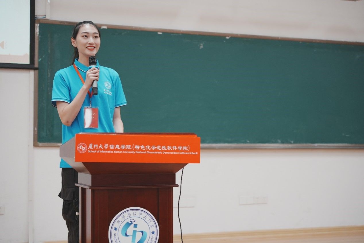 接下来,往届优秀营员代表范馨文与大家分享经历感悟。她从自身的夏令营经历谈起,希望大家保持自信、从容面对。她结合自己在厦大信息学院就读研究生经历,为营员们介绍了她在信息学院的学习科研生活以及自身感受等。