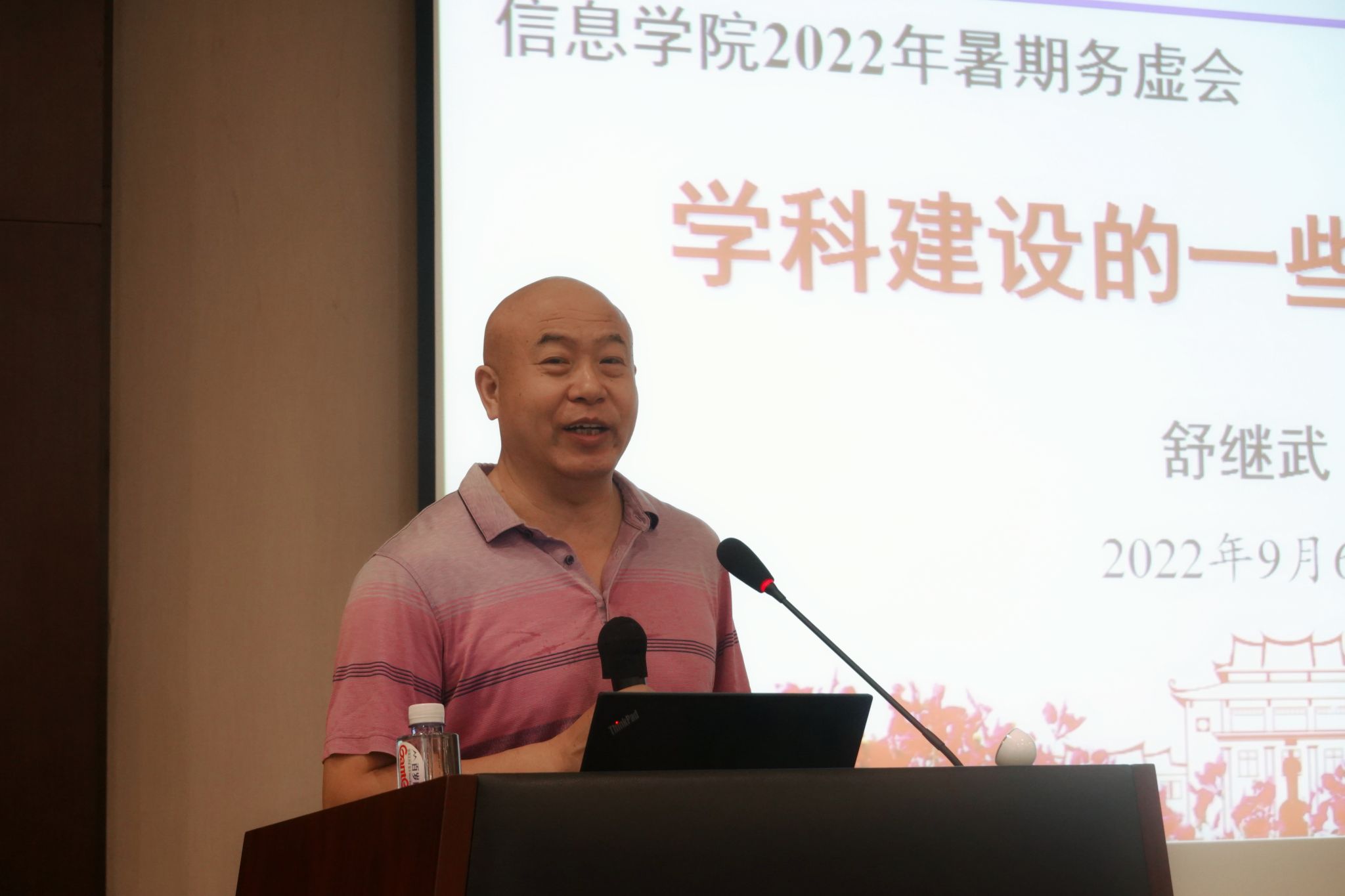 院长舒继武做主题报告。他表示,从国家近年来对信息学科发展的重视以及大力推动以信息化、数字化为主要领域的科技创新变革来看,未来的5年,是信息学院、信息学科发展的重要机遇期。要结合学院发展和学科现状,最大限度用足现有资源、用好现有队伍,继续狠抓学院十大重点行政工作任务的落实,推动学院综合改革不断取得新突破。